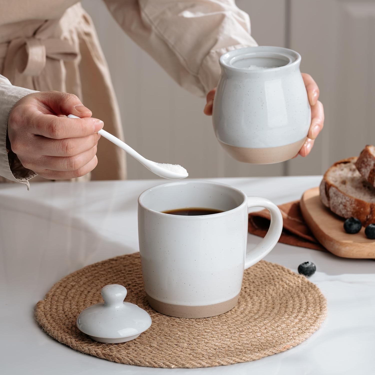 - Sugar Bowl with Lid and Spoon: This 10-ounce sugar bowl (2.7" diameter x 4.7" height) is perfect for daily use. Ideal for storing granulated sugar, sugar cubes, sweeteners, salt, spices, or even coffee beans.