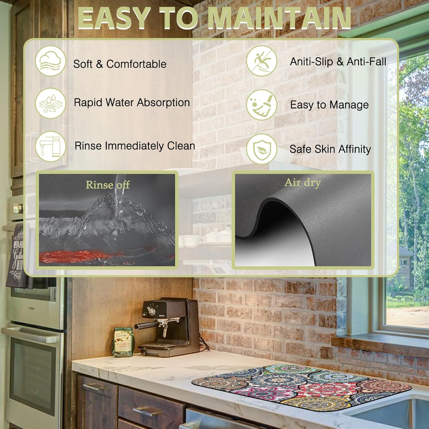 Dish Drying Mat Bohemia Vintage Decorative Pattern Kitchen Mat 16"x24" Bsorbent Coffee Maker Mat for Dishes,Utensils Coffee Maker Pots and Pans Easy Clean Dish Slip Resistant Pad