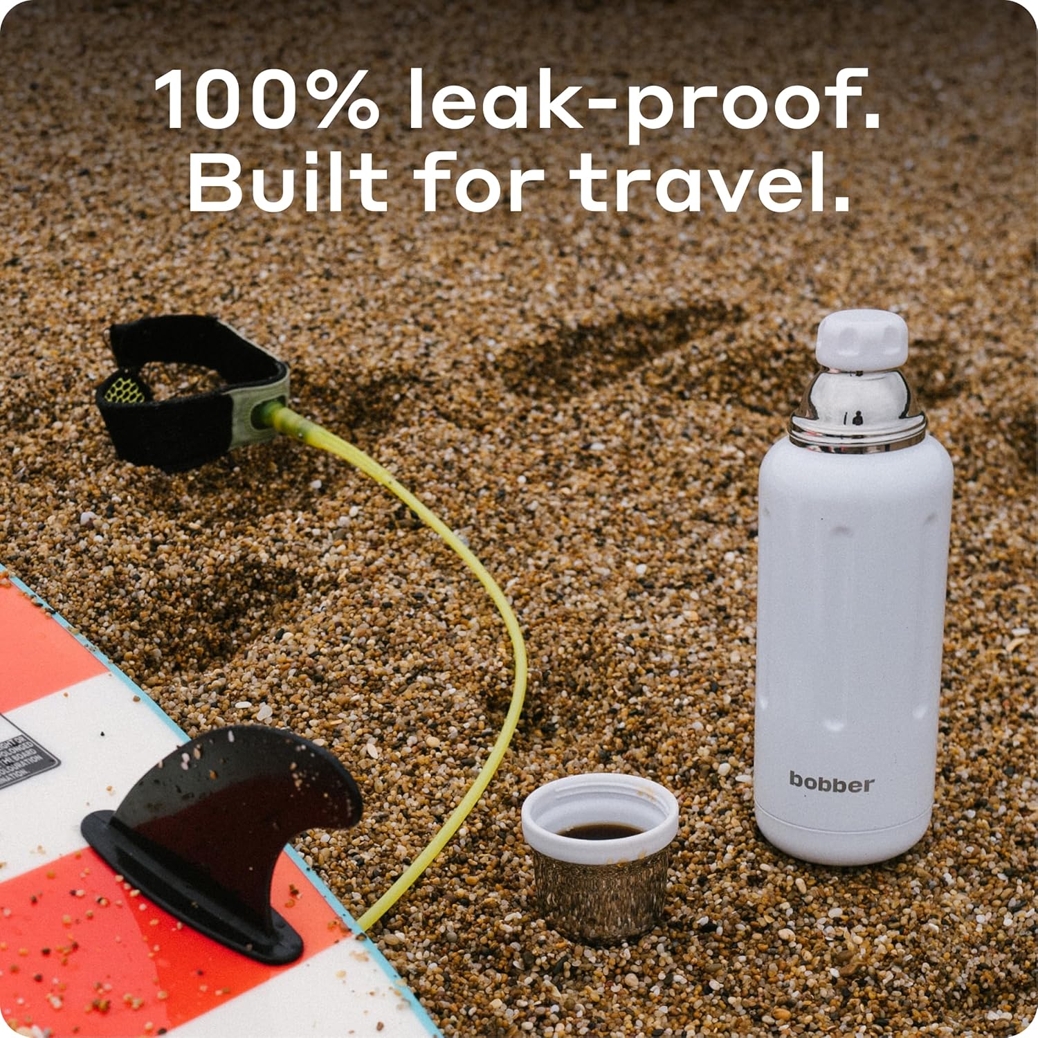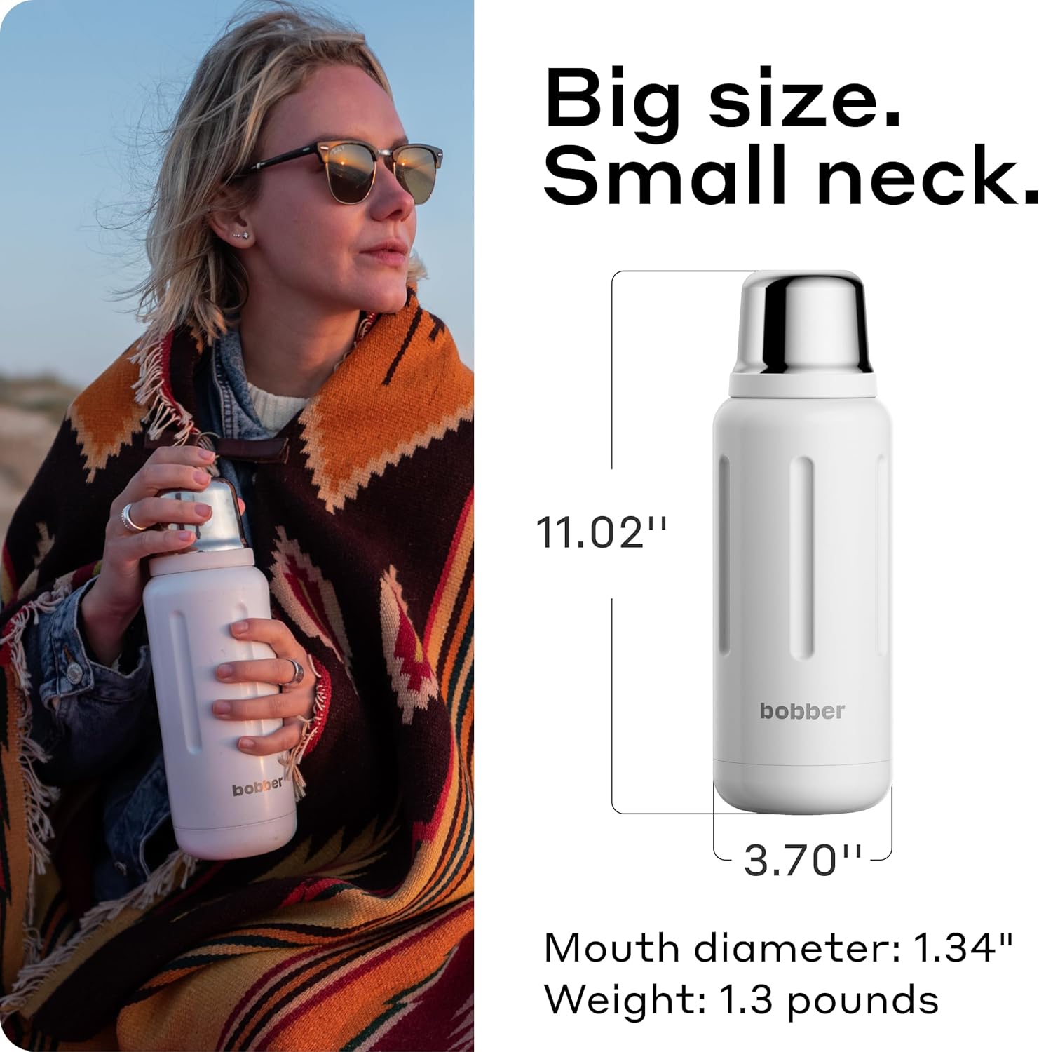 BOBBER 34 oz Stainless Steel Travel Thermos for Hot and Cold Drinks – Dishwasher Safe Metal Water Bottle with Cup Lid – Keeps Hot for 48 Hours – BPA-Free, Vacuum Insulated (White)