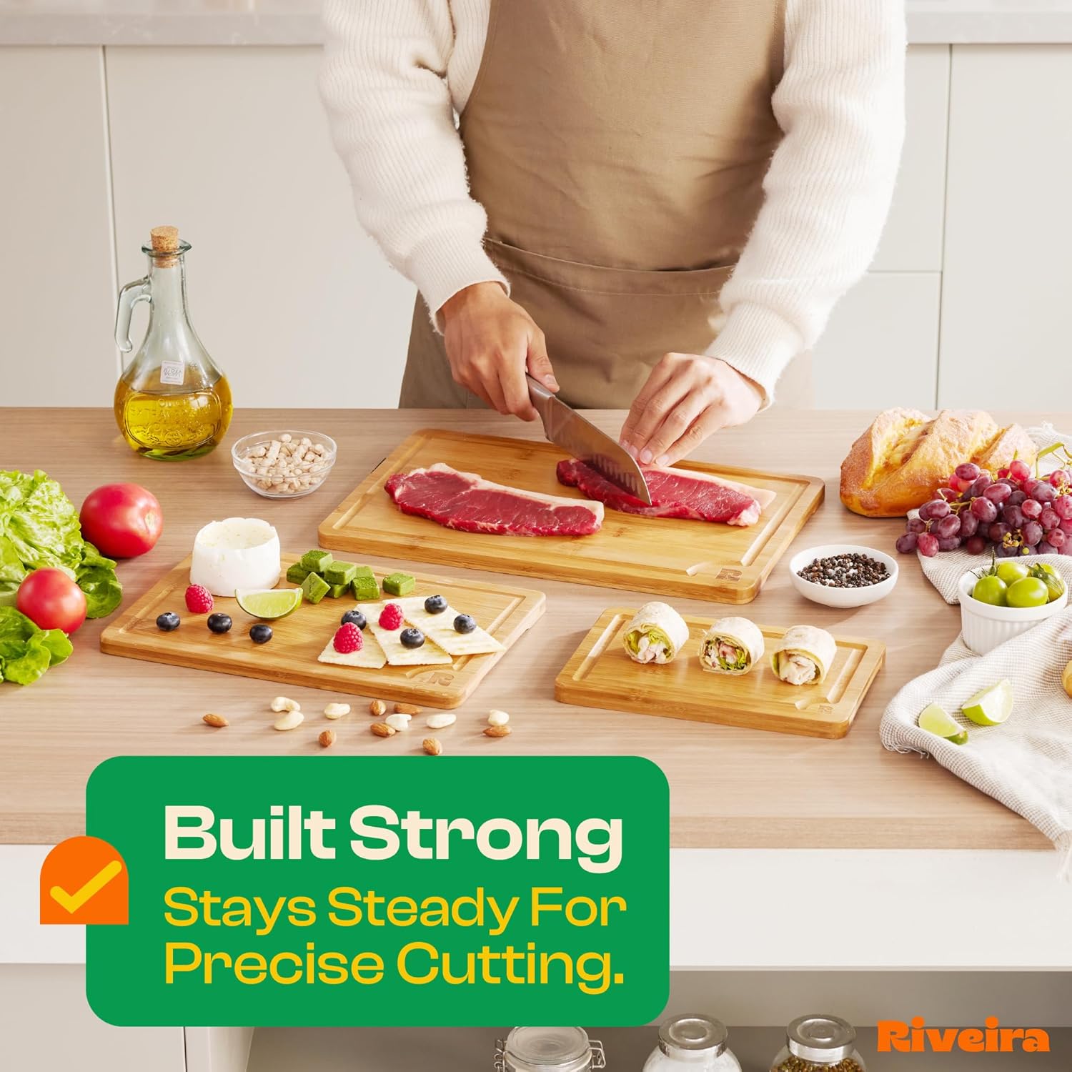 Riveira Brown Bamboo Wood Cutting Board – Versatile And Durable: Set Of 3 Pcs Rectangular Wooden Cutting Board – Natural Wooden Cutting Boards For Kitchen Set – Complete Bamboo Wooden Chopping Board
