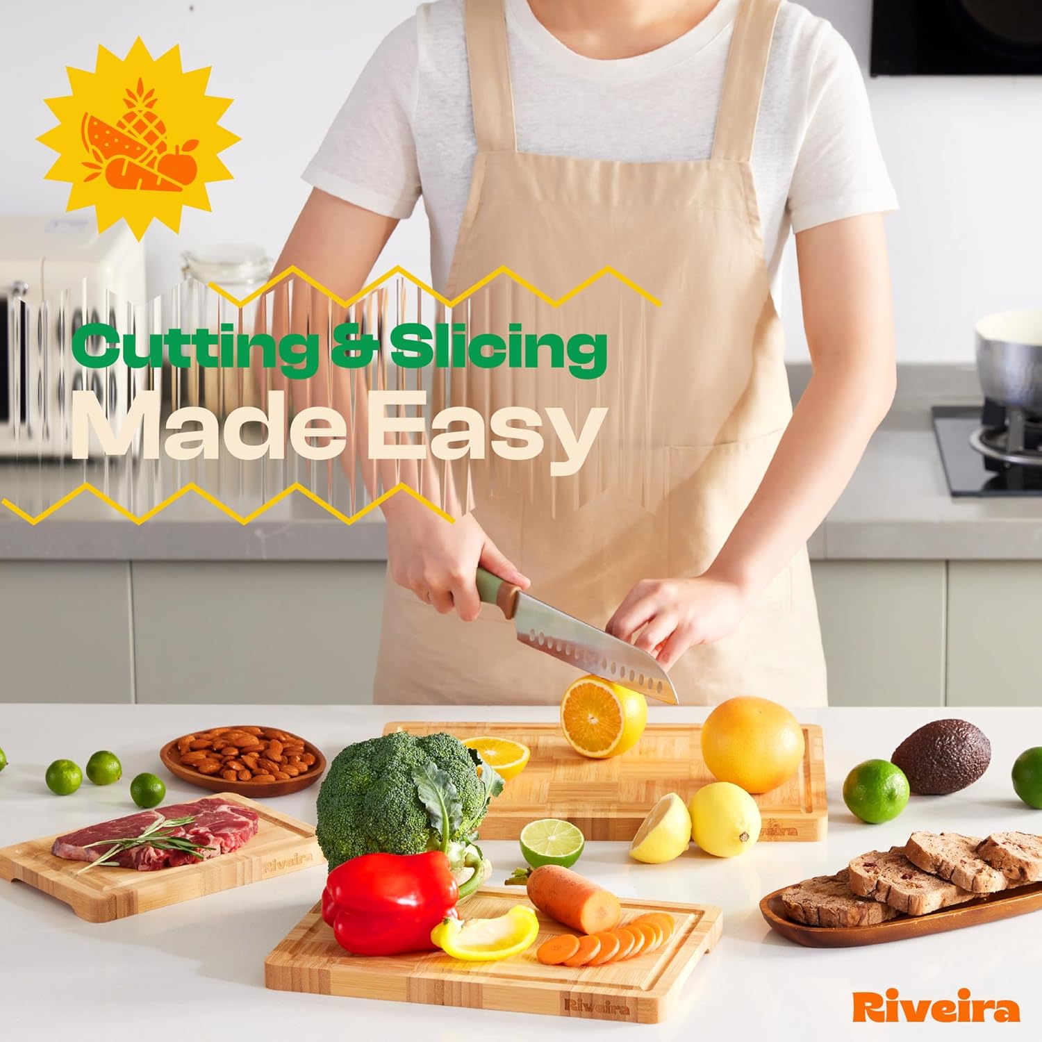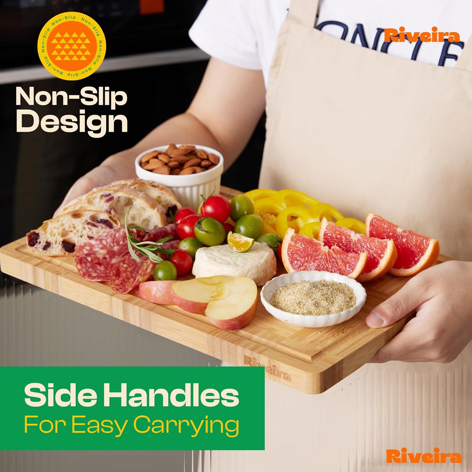 - Premium Crafted Bamboo — Take a detour from traditional kitchen aesthetics with this bamboo wood board crafted from 100% natural bamboo. Beyond being an unconventional and eco-friendly choice, the chopping board wood proudly showcases the environment friendly and organic bamboo. This wood cutting boards for kitchen counter adds an unexpected touch of confidence and style to your once-orderly culinary space. Riviera's wooden chopping boards for kitchen will be there for you.