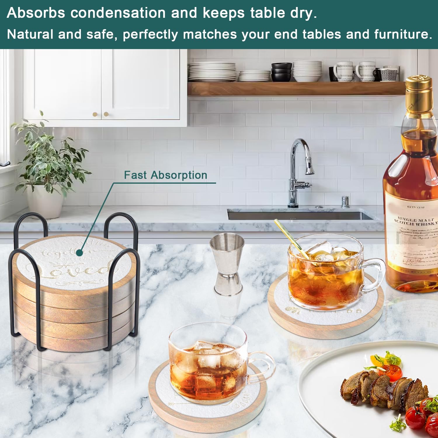 Wood Coasters for Drinks Housewarming Gifts for Home Decoration Absorbent Coasters with Holder for Coffee Tabletop Protection 4.3 Inch White