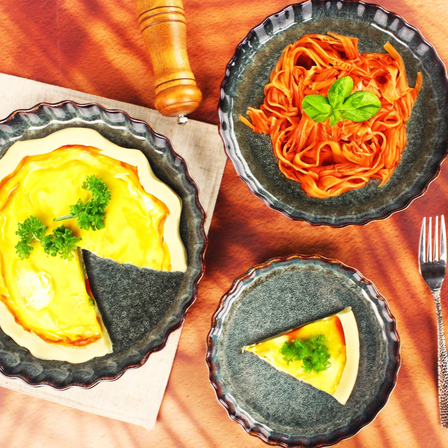 - SIZE AND CAPACITY - These 11.6"W x 1.7"D inch round quiche baking dishes, each with a capacity of 47 Ouncest(1400 ML), are perfect for a range of dishes, including meat pies, pizza, cheesecake, dessert pies, quiche, casseroles, and baked macaroni. Ideal for holiday pie-making, they are also versatile for baking, serving, and daily use.