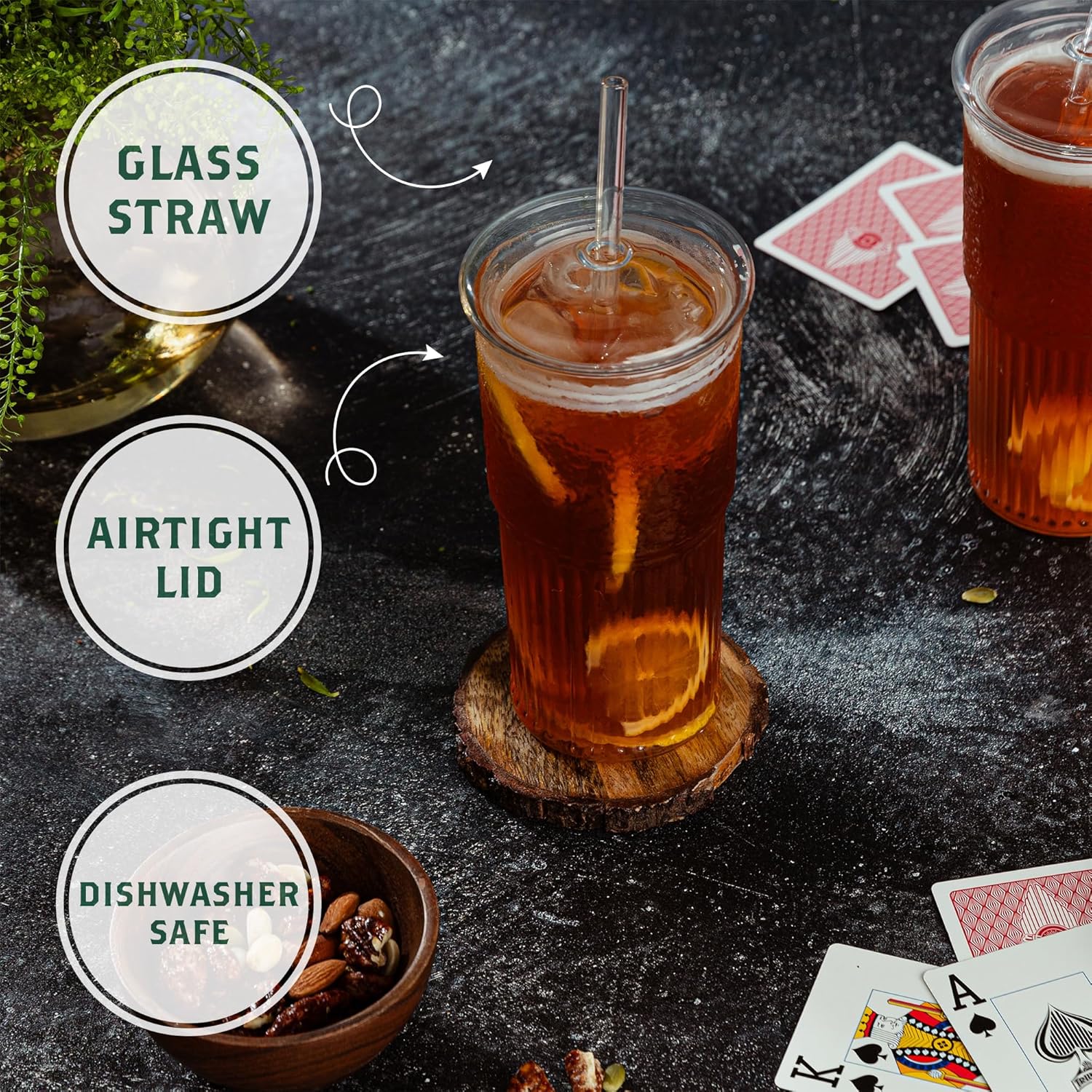 Glass Cups with Lids & Glass Straws, 20 Ounce High Borosilicate Iced Coffee Tumbler 2 Pack