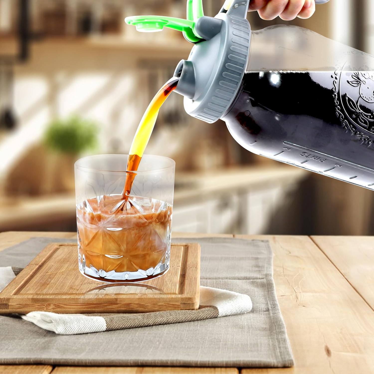 - LEAK PROOF & AIRTIGHT STORAGE - Mason Jar coffee Pitcher with silicone seal that will ensure not leak what so ever (even while shaking it upside-down). The top flip cap has a secure snap fit closure that will not leak neither. Airtight container to keep your drinks fresh