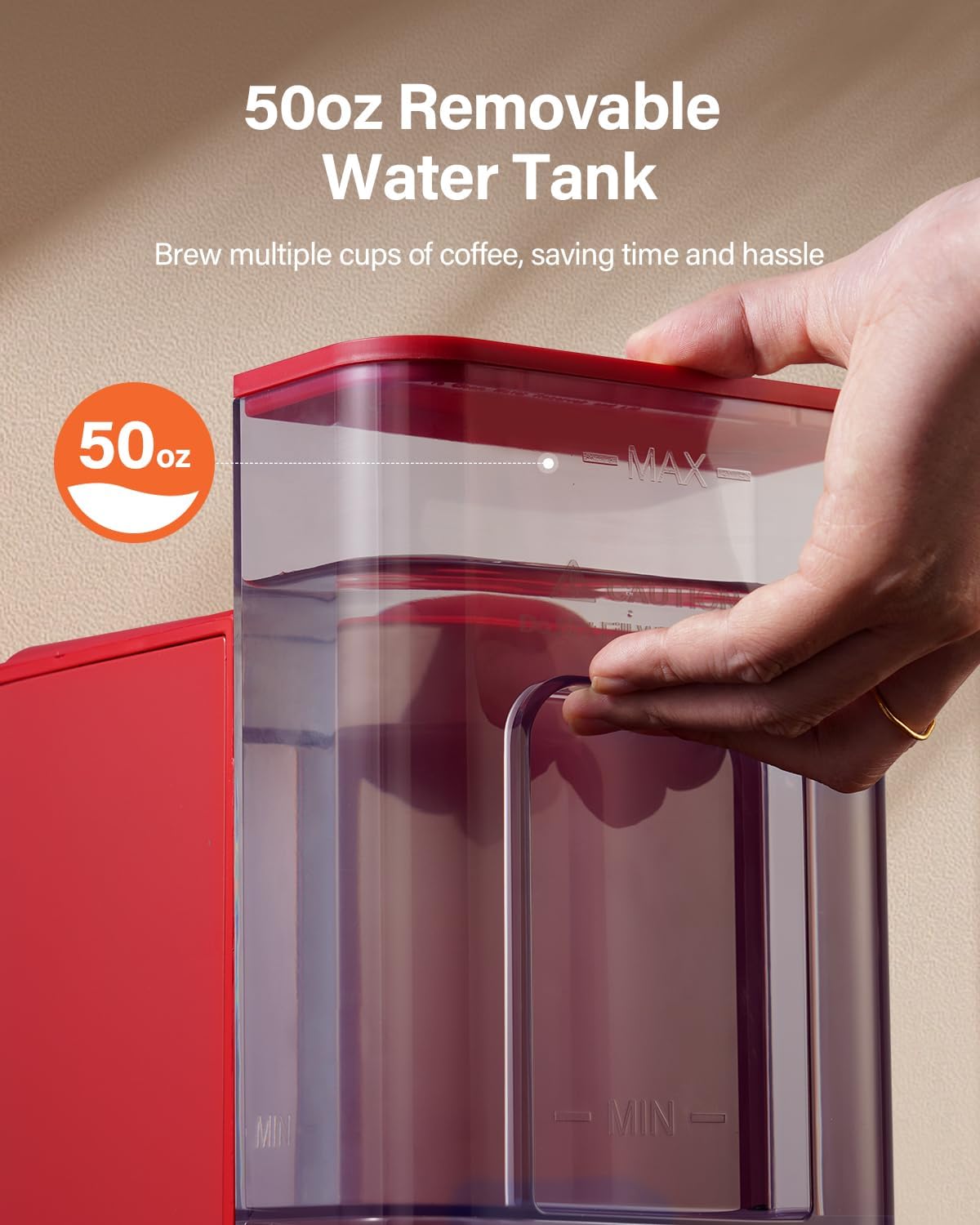 - 50 OZ REMOVABLE WATER TANK: The 50 oz large capacity enables brewing multiple cups of coffee at once, saving time and hassle; the fully visible water tank makes it easy to spot any impurities or build-up inside the tank for cleaning and maintenance