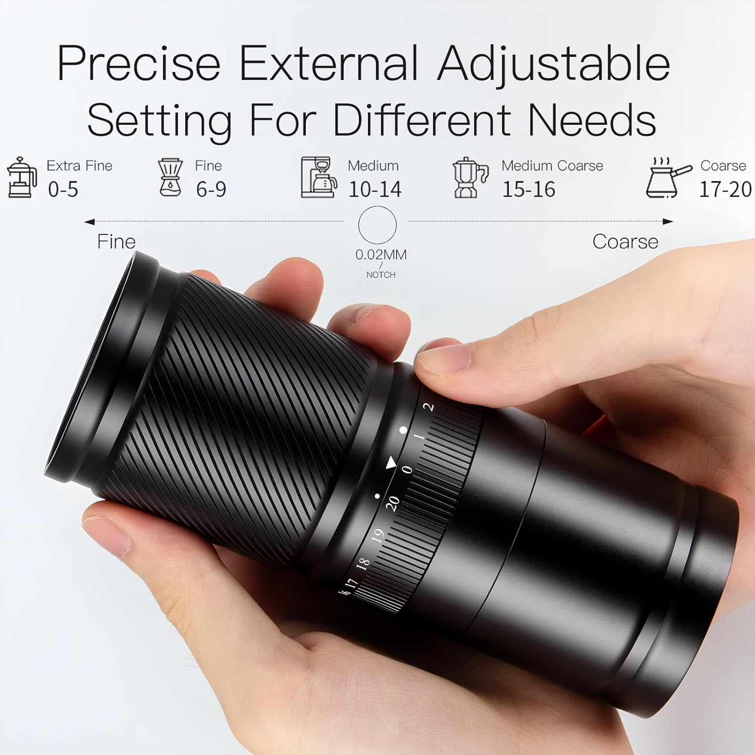 - Precise External Adjustable Setting: The precise external adjustment ring offers 20 adjustable levels, 20 microns per click, over 120 clicks adjustable, allowing for fine control over grind size with smooth rotation and easy operation. the DACLL hand coffee grinder is perfect for all coffee lovers, from intense espresso to delicate pour-over coffee, with precise adjustments