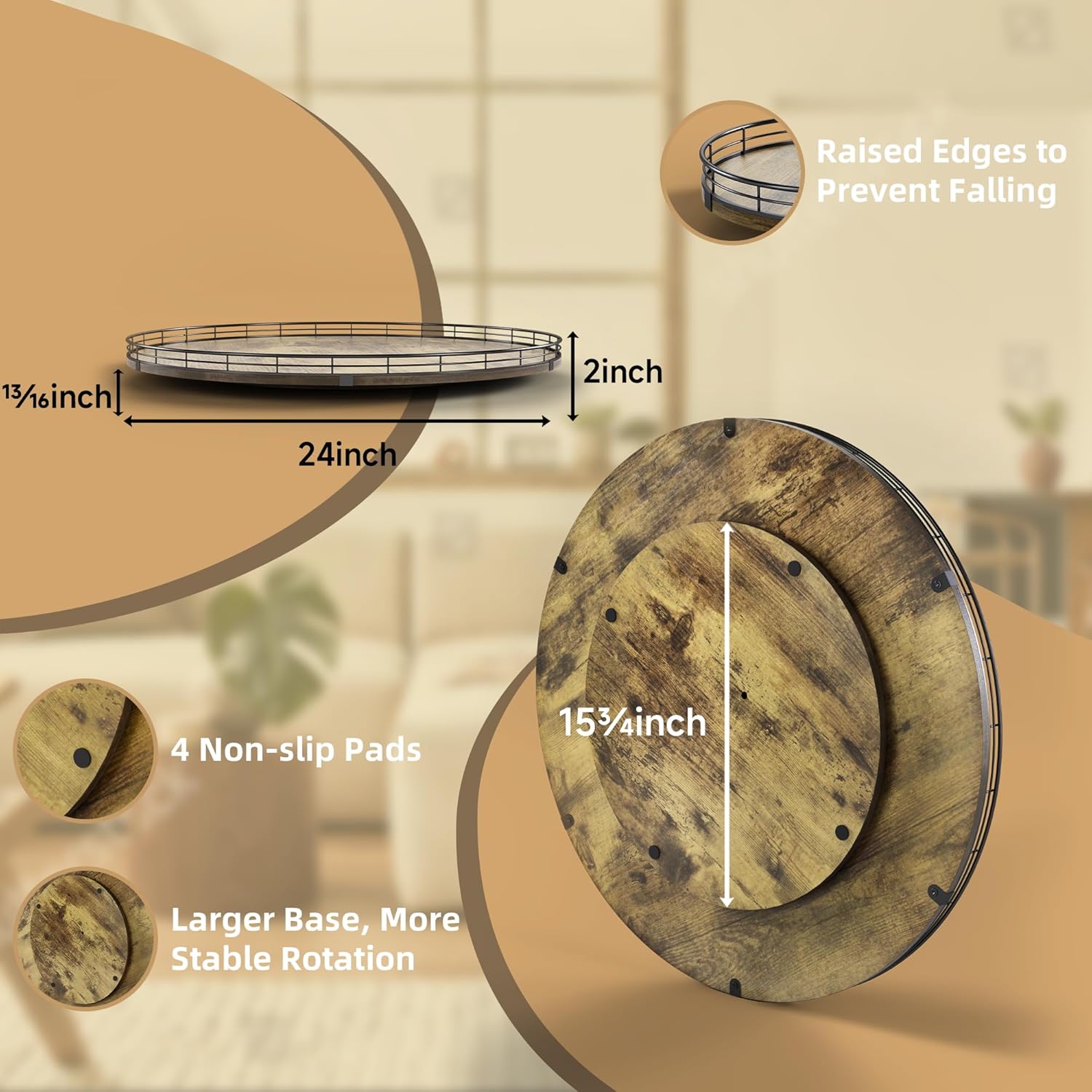 - Thoughtful Design - The raised edges are made of iron, which is sturdy and prevents items from falling off the turntable. The base is large enough and equipped with 3 anti-slip pads, the rotation is smoother and prevents scratches. No installation required, easy to use