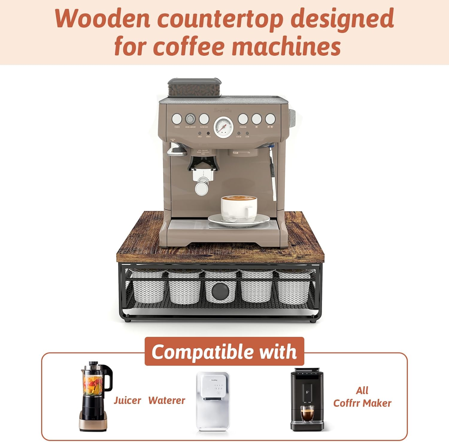 - Durable and Sturdy Design :Crafted with a Robust Iron Frame and a Sleek Wooden Desktop, this Coffee Pod Holder Provides Reliable Support for Your Coffee Maker and Brewer. Its Simple yet Elegant Design Complements a Variety of Coffee Machines, Making it the Perfect Addition to Your Office, Kitchen, Living Room, or Cafe.