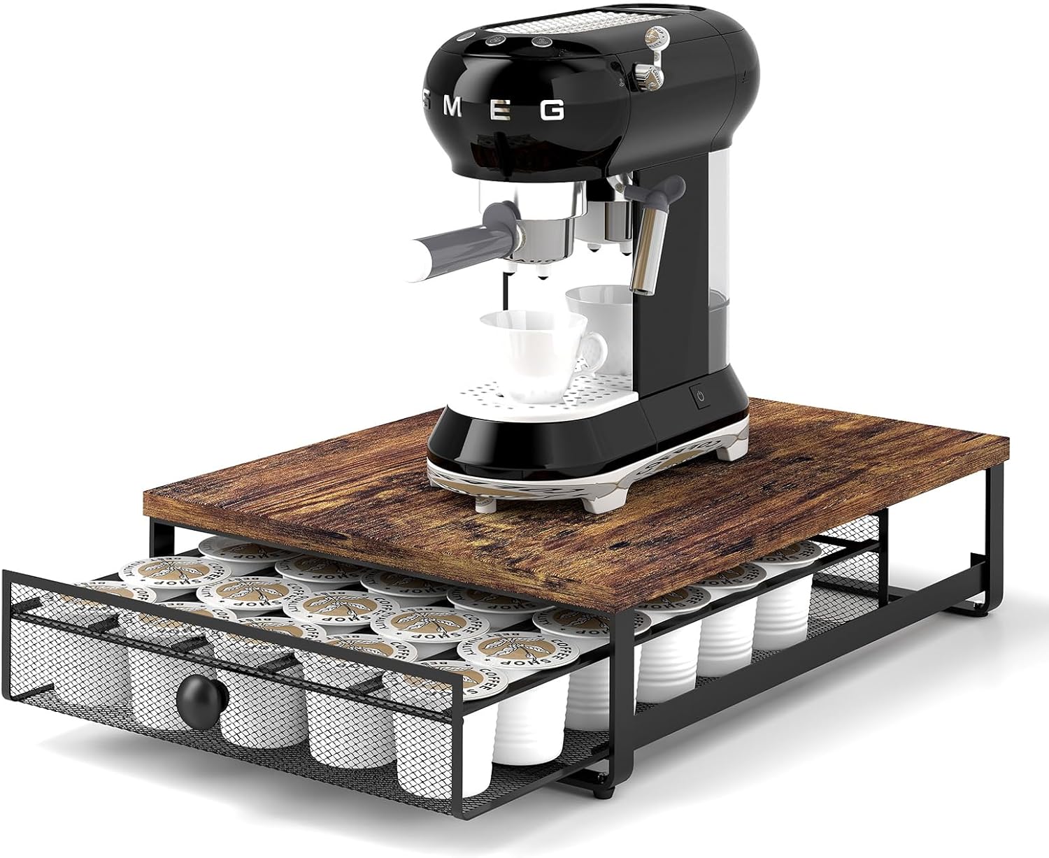 - Premium Materials & Easy Cleaning :The K-Cup Storage Drawer is made from High-Quality Carbon Steel and Durable Particle Board, Preventing Deformation and Ensuring Long-lasting Use. Equipped with Soundproof Pads on the Sliding Rails, the Drawer Opens and Closes Quietly, Avoiding any Noise. The Wood Desktop is Easy to Clean — Just Wipe away any Coffee Spills with a Cloth for a Fresh Look.