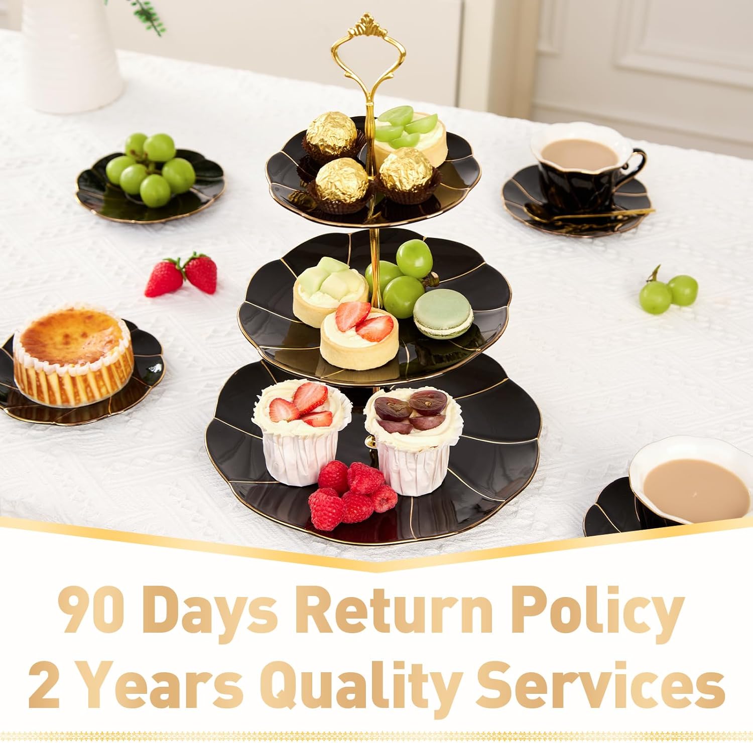 - 【3-Tier Luxury Porcelain Stand, Elevate Your Dessert Display】DUJUST 3-tier cake stand features black porcelain plates with an elegant petal shape. Adorned with a delicate golden rim, it exudes luxury. Look at the top gold handle, it will remind you of a queen's crown, unique and exquisite. On this stand, you can show carefully prepared dessert snacks and cakes, and make your party perfect. Ideal for entertaining friends, this stand offers a refined way to savor life's sweet moments.