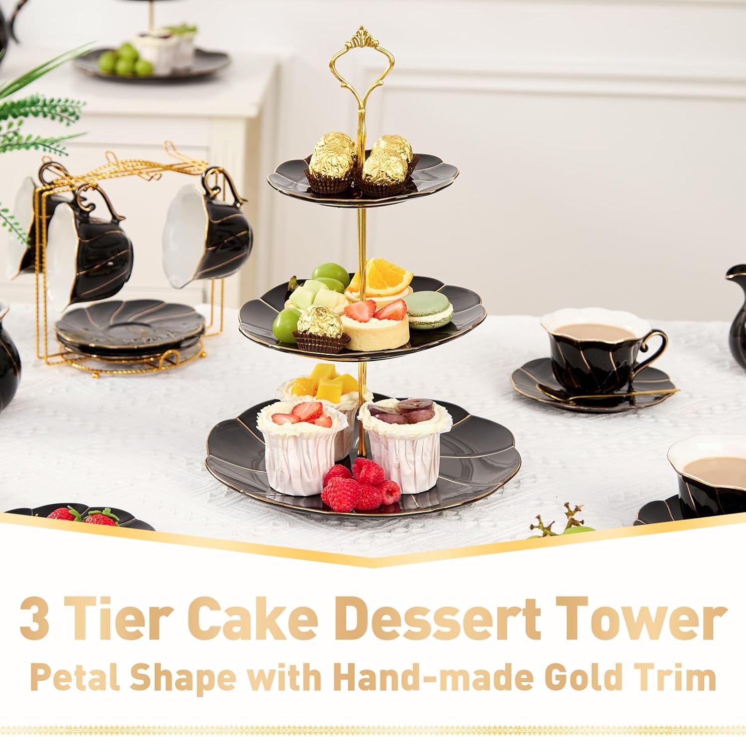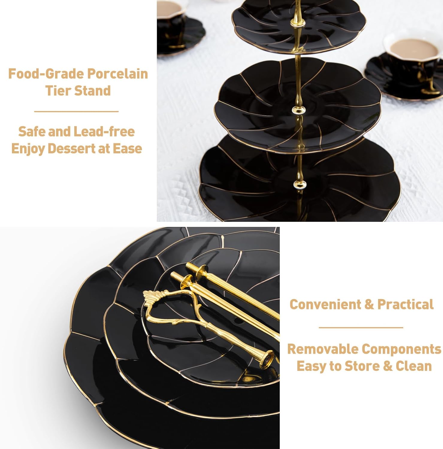DUJUST Luxury Porcelain 3-Tier Cupcake Stand Tower, British Style Serving Tray with Golden Trim, Food Grade Dessert Display Stand, Beautiful Gift for Tea Party & Home Décor - Black