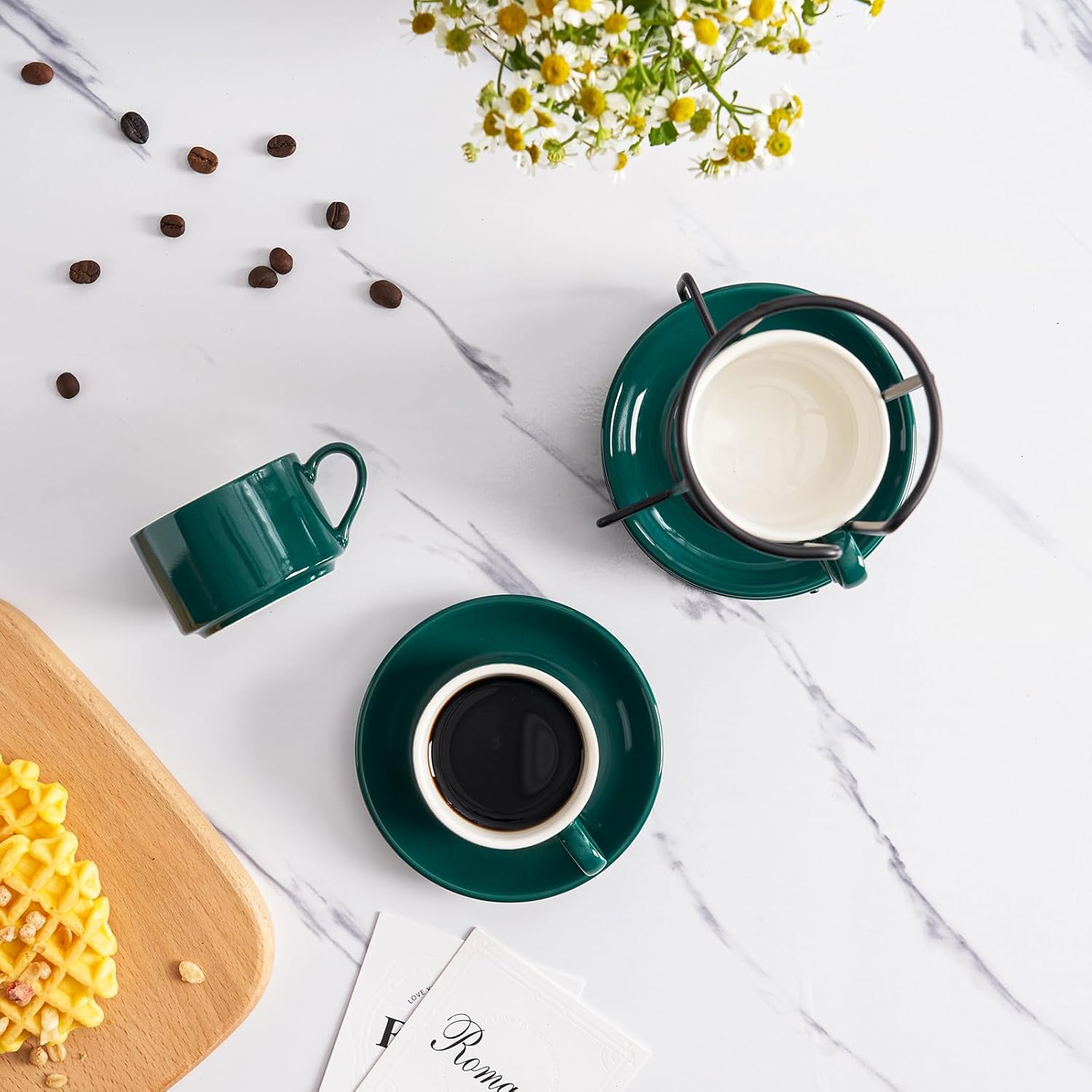 - 1.Elevate your kitchen experience with the MEICHU Espresso Cups Set. This set includes 4pcs 4 Ounce Espresso Cups with Saucers and Metal Stand, all in a classic green color. Perfect for people who enjoy coffee and conversation!