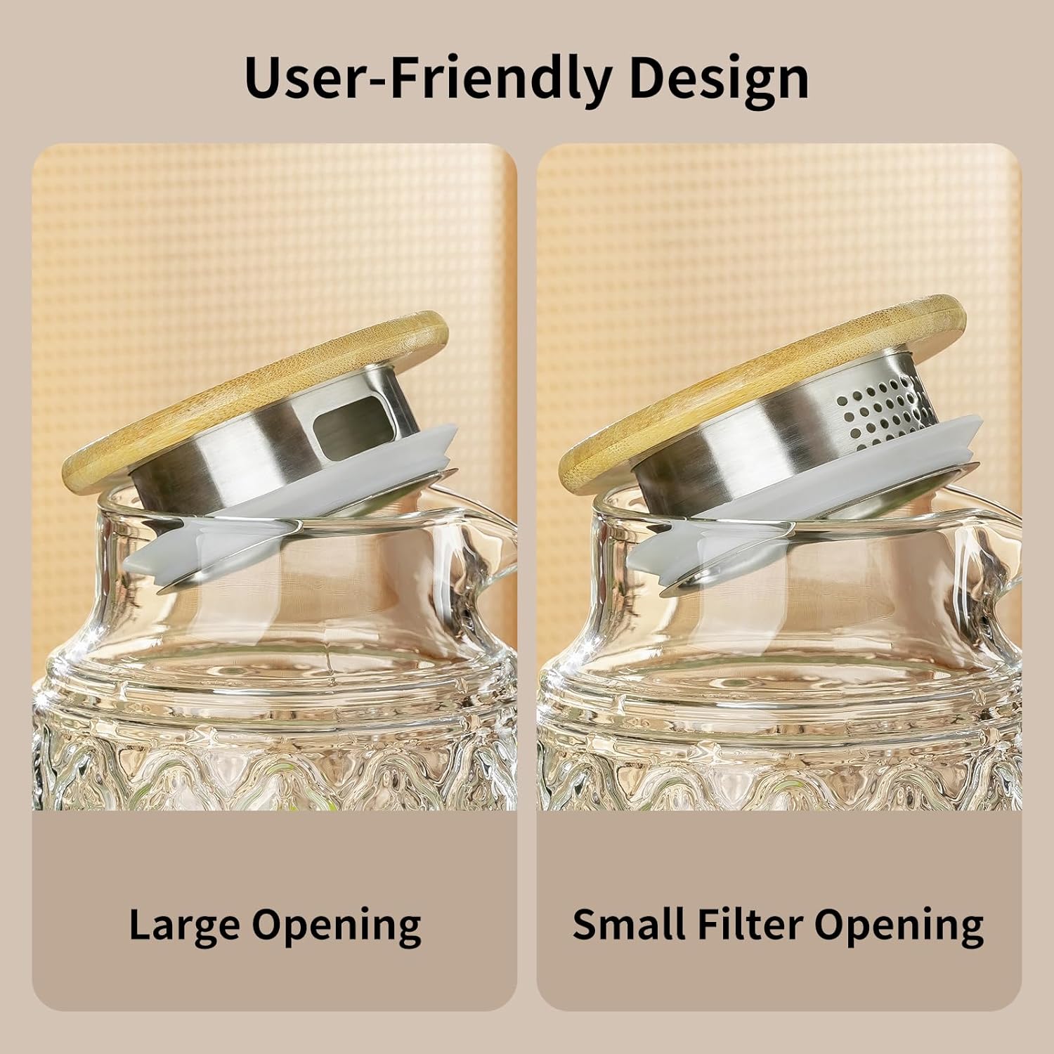 - 【BEAUTIFUL BAMBOO LID AND PRACTICAL HANDEL 】This bamboo lid has two openings, which can be turned to pour water or the other side to filter beverages. The soft silicone seal keeps the lid firmly on the lid to prevent leakage. Specially designed with an anon-dripping spout and ergonomically designed handle makes it easy to hold and pour.