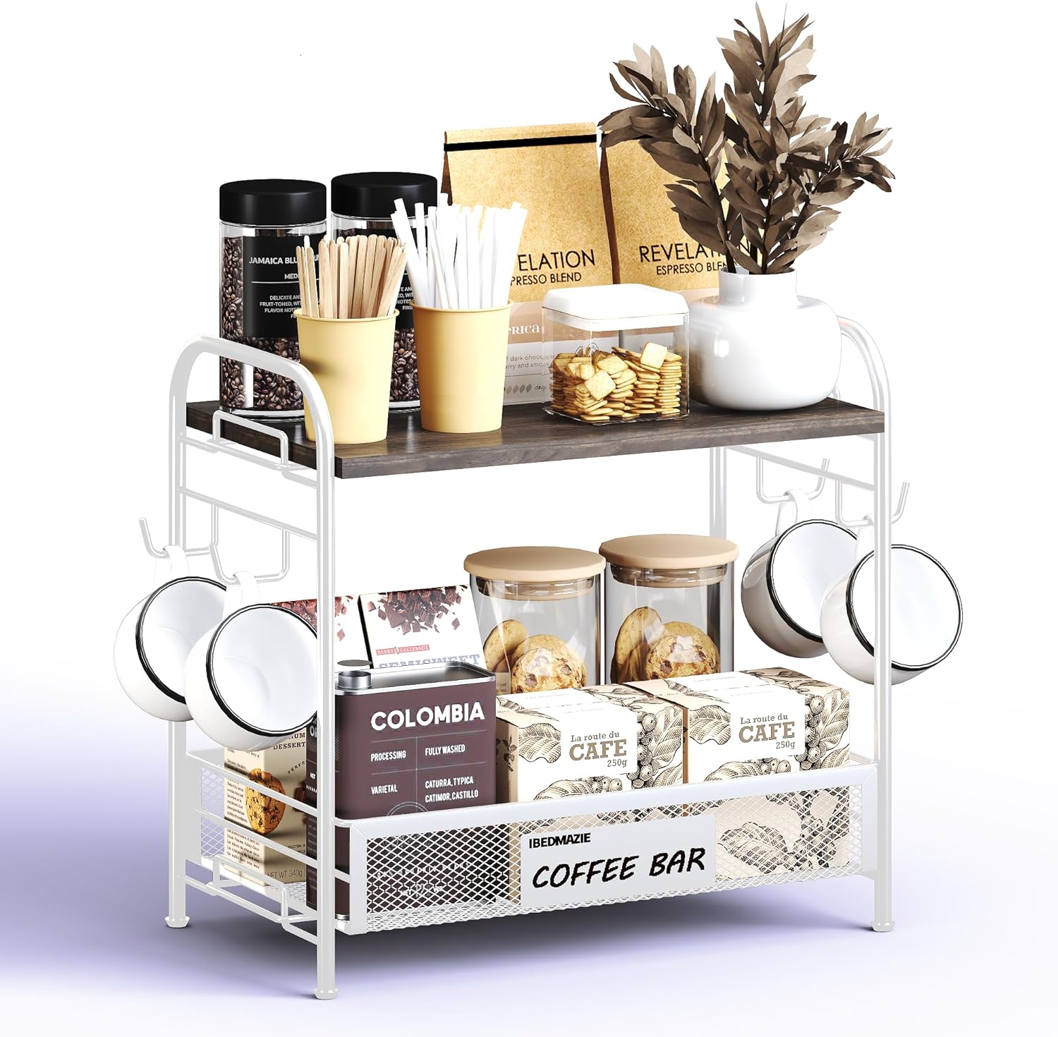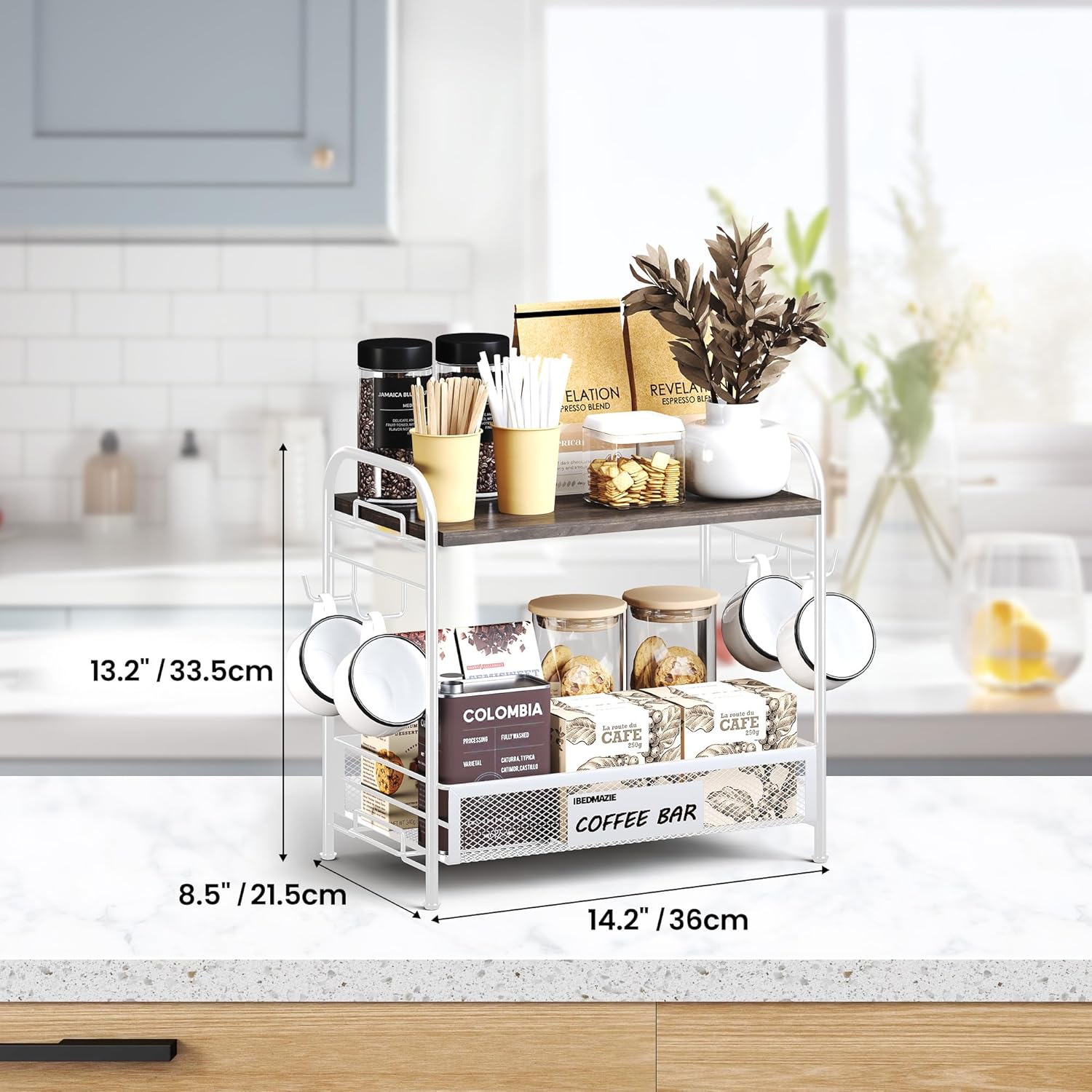 Coffee Bar Organizer for Countertop Station, Simple Assembly 2 Tier Shelf for Home,Office, Coffee Cup Holder Storage Organization for Counter Accessory Storage Rack with 4 Hooks Space-Saving