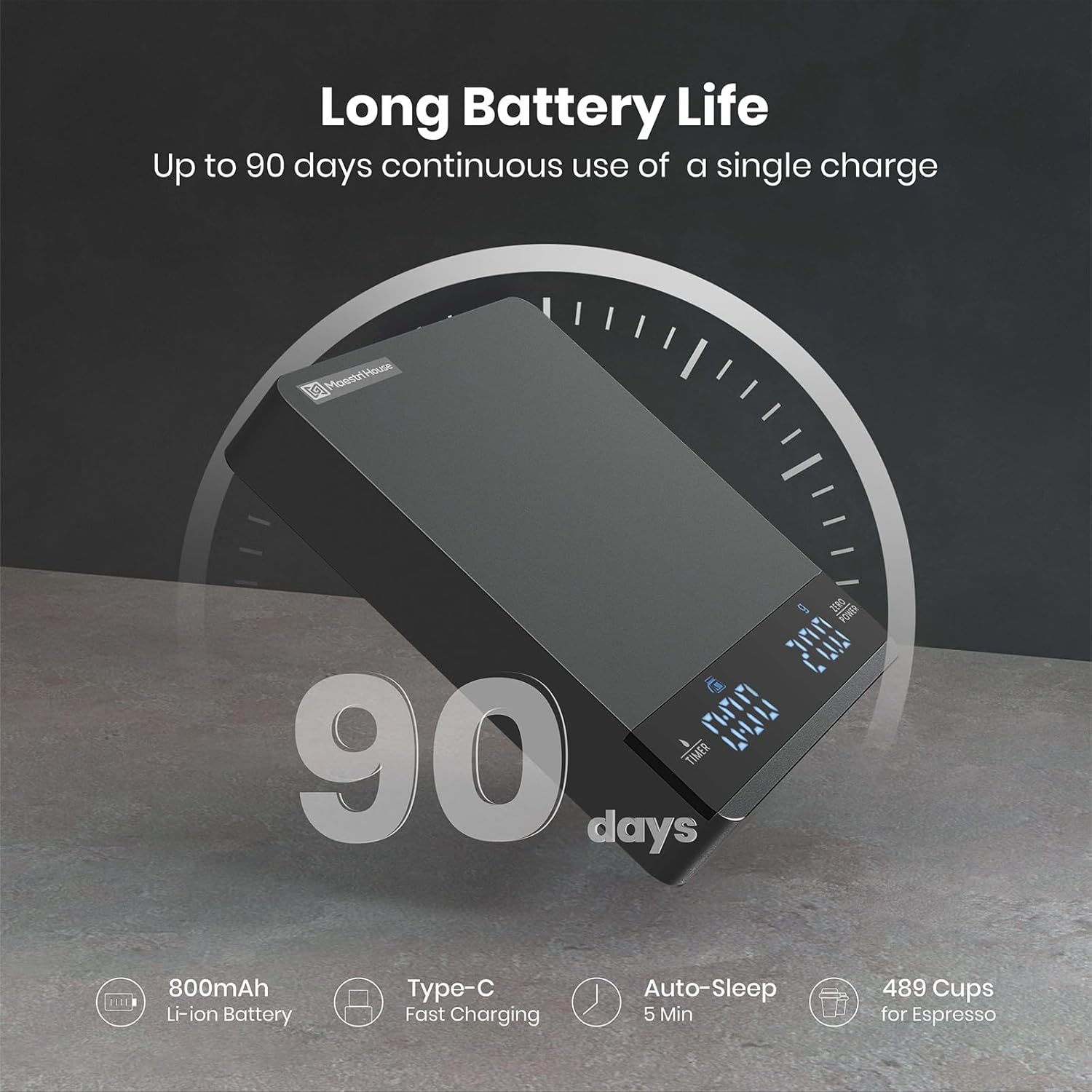 - 【Long Standby Rechargeable Battery】This digital coffee scale comes with an 800mAh lithium battery and a USB-C charging cable, eliminating the need for disposable batteries. Enjoy up to 90 days of use on a single charge. To conserve power, the scale automatically enters sleep mode after 5 minutes of inactivity, extending battery li