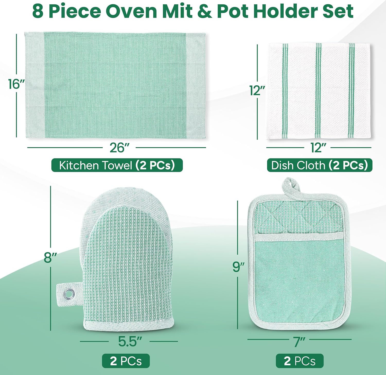 Casa Platino Potholders & Oven Mitts Heat Resistant, 8-Piece Mini Oven Mitts with Silicone Grip, Potholders for Kitchens, 2 Kitchen Towels & 2 Dish Cloths – Durable & Non-Slip – Sage