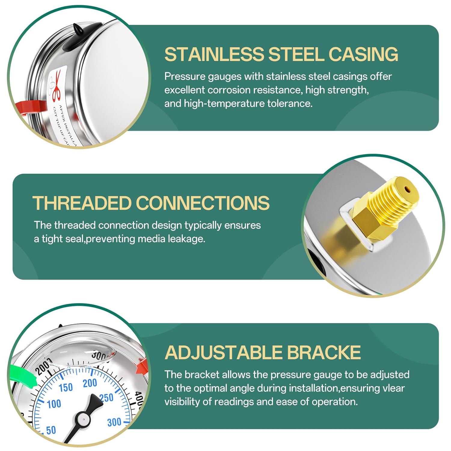 - [MATERIAL FEATURES] 304 stainless steel housing, corrosion-resistant, glycerin filled for stable readings and to avoid vibration damage.