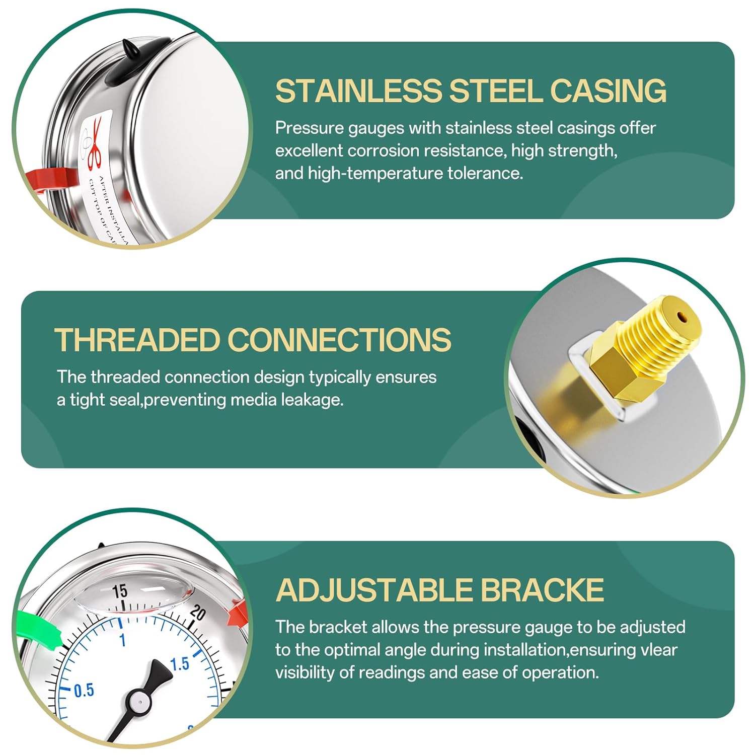 - [MATERIAL FEATURES] 304 stainless steel housing, corrosion-resistant, glycerin filled for stable readings and to avoid vibration damage.