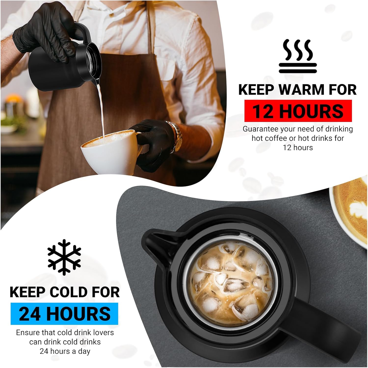- Double-wall Vacuum Insulation: Perfect for hot water,hot cocoa, milk, or coffee, this double-wall vacuum insulated coffee carafe features advanced insulation to keep your drinks at the ideal temperature for hours