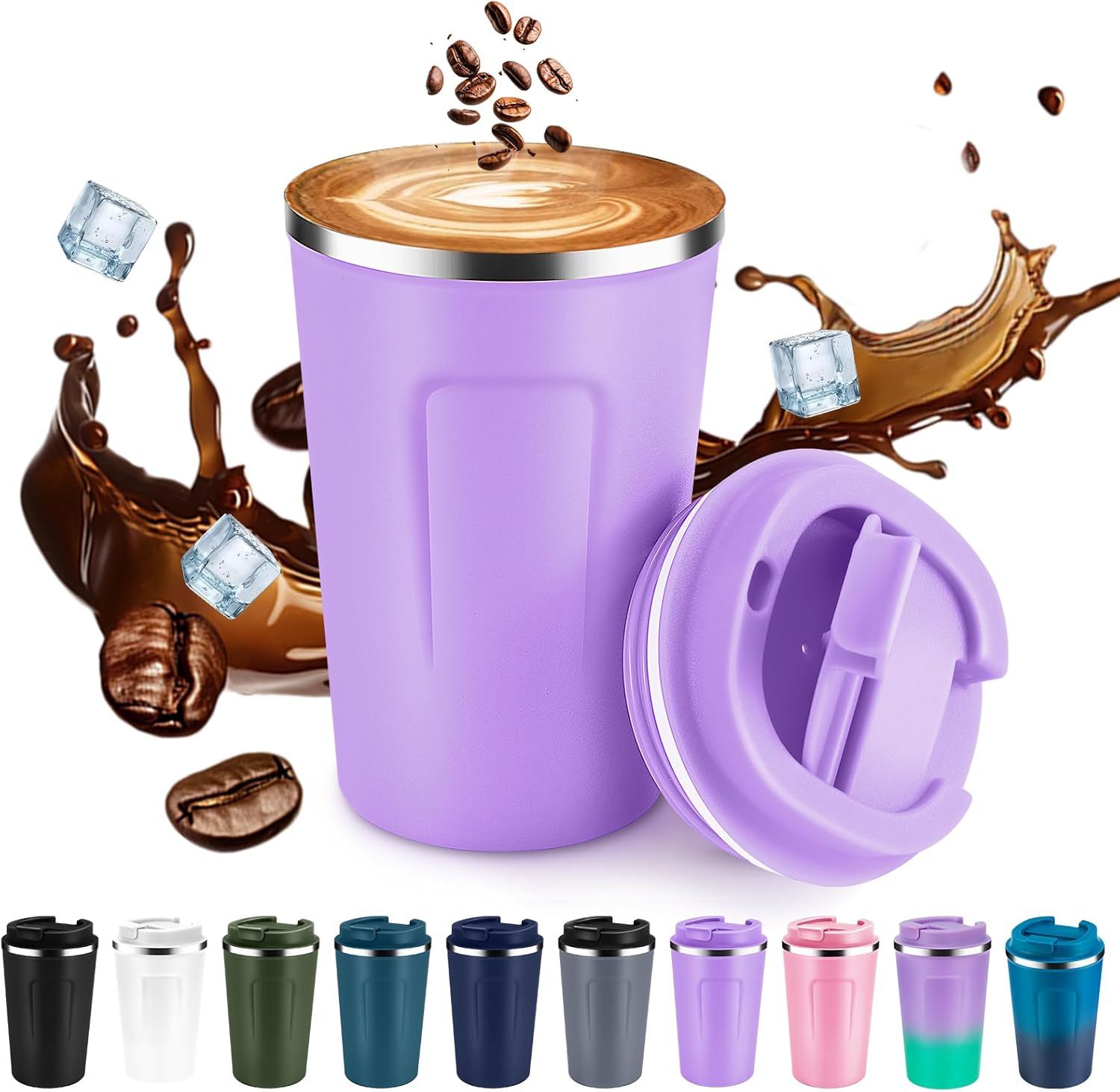 Volhoply 12 oz Double Wall Insulated Vacuum Travel Coffee Mug with Flip Lid,Reusable Stainless Steel Leak Proof Coffee Cup,Portable Cafe Thermal Tumbler Suitable for Hot & Cold Drinks(Purple,1 Set)