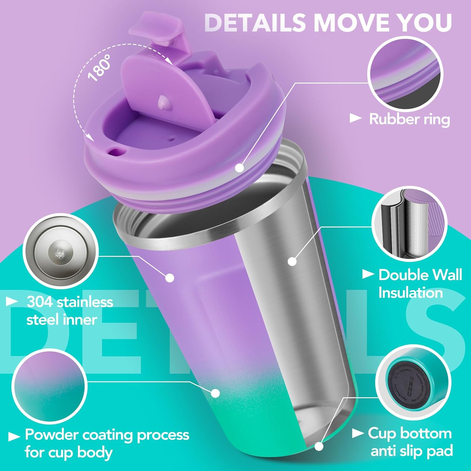 Volhoply 12 oz Double Wall Insulated Vacuum Travel Coffee Mug with Flip Lid Bulk 2 Pack,Reusable Stainless Steel Leak Proof Coffee Cup,Cafe Thermal Tumbler for Cold & Hot Drinks(Purple Green,2 Set)