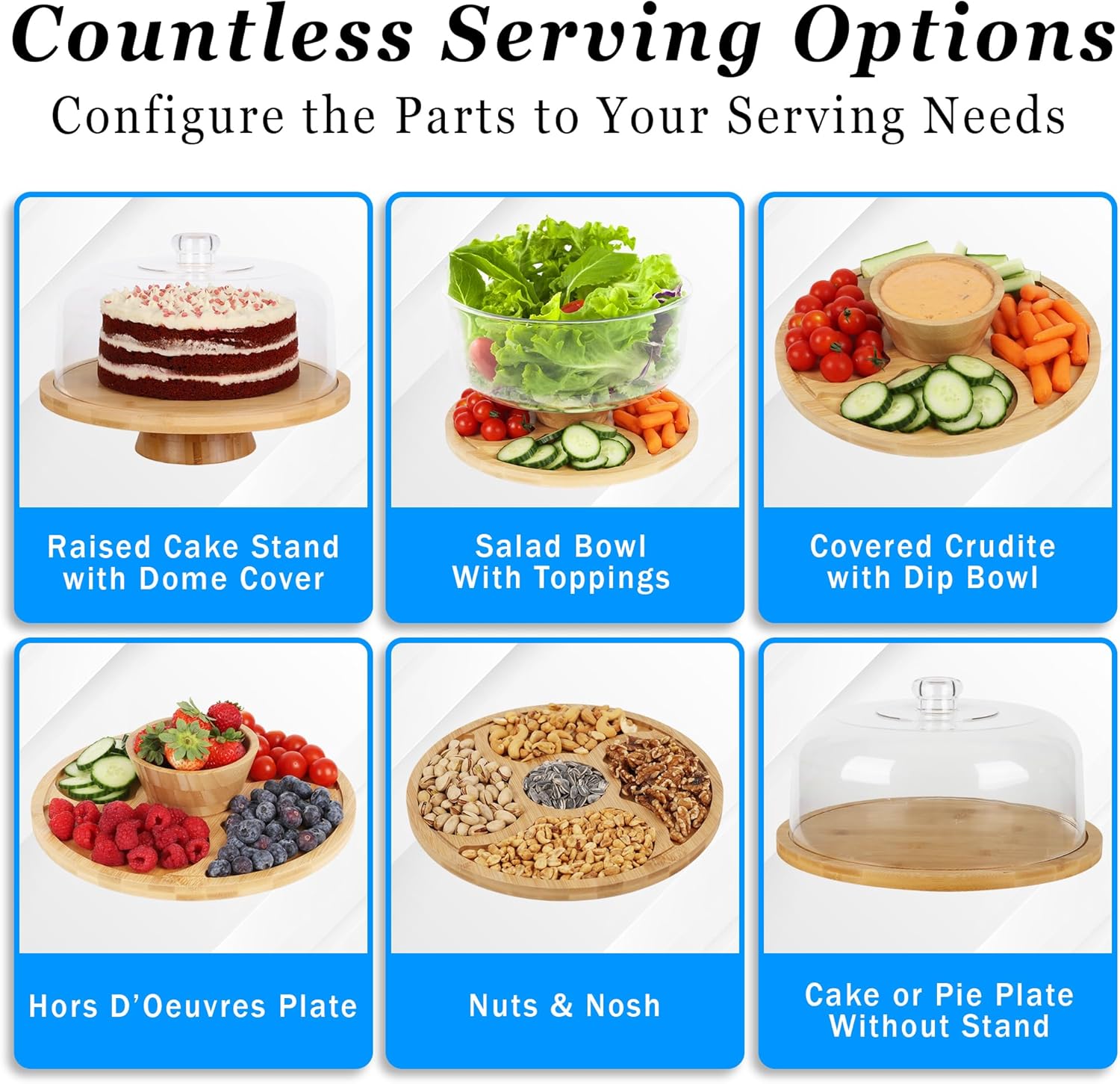- MULTIFUNCTIONAL This versatile cake pedestal stand does more than just display cakes. Use it to serve horderves with dips, punch, and desserts. The bamboo cake holder stand doubles as a serving tray, while the durable acrylic dome keeps your treats fresh and protected.
