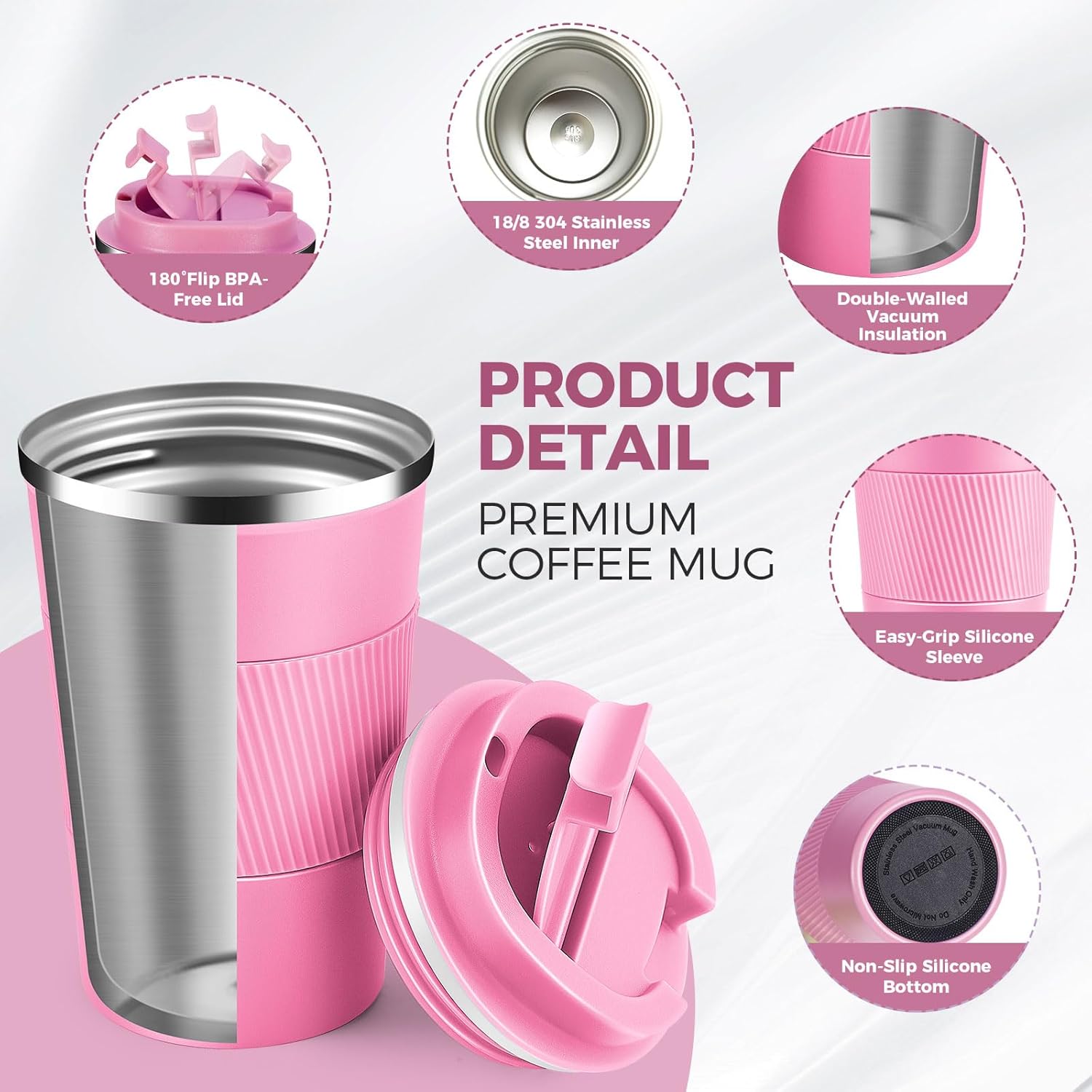 Volhoply 13 oz Stainless Steel Insulated Travel Coffee Mug with Fip Lid Bulk 8 Pack,Reusable Double Wall Vacuum Metal Coffee Cup,Portable Leak Proof Thermal Tumbler for Hot & Cold Drinks(Pink,8)