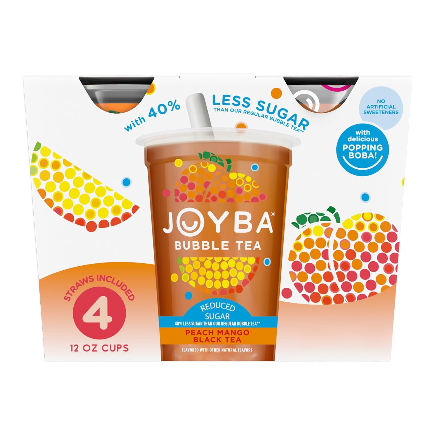 - Joyba Reduced Sugar Peach Mango Black Tea Bubble Tea contains 40% less sugar than our regular JOYBA Bubble Tea.