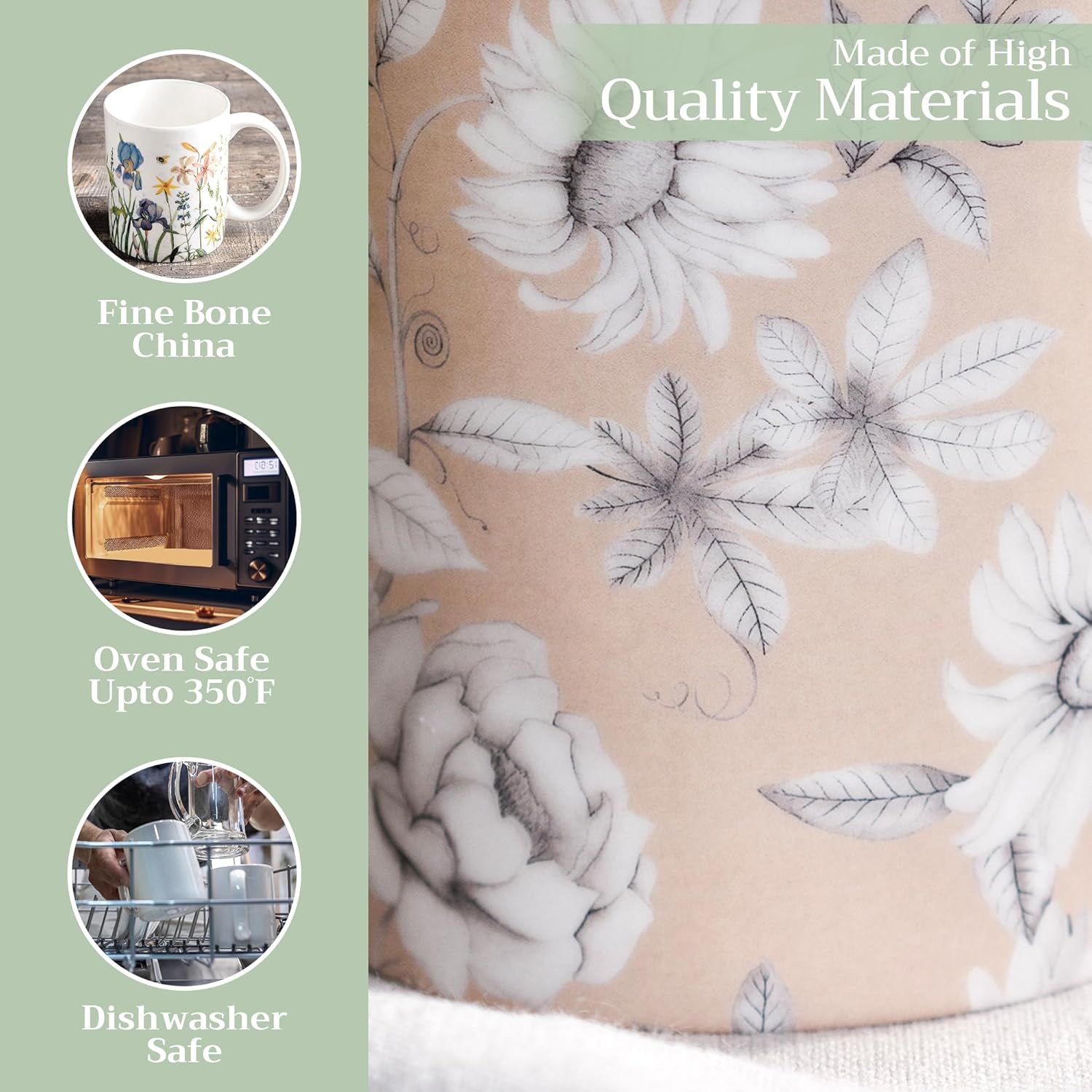 - Easy Care & Maintenance: Microwave, dishwasher, and oven safe up to 350°F. These bone china mugs are built for convenience and durability, making cleanup and reheating simple without compromising on quality