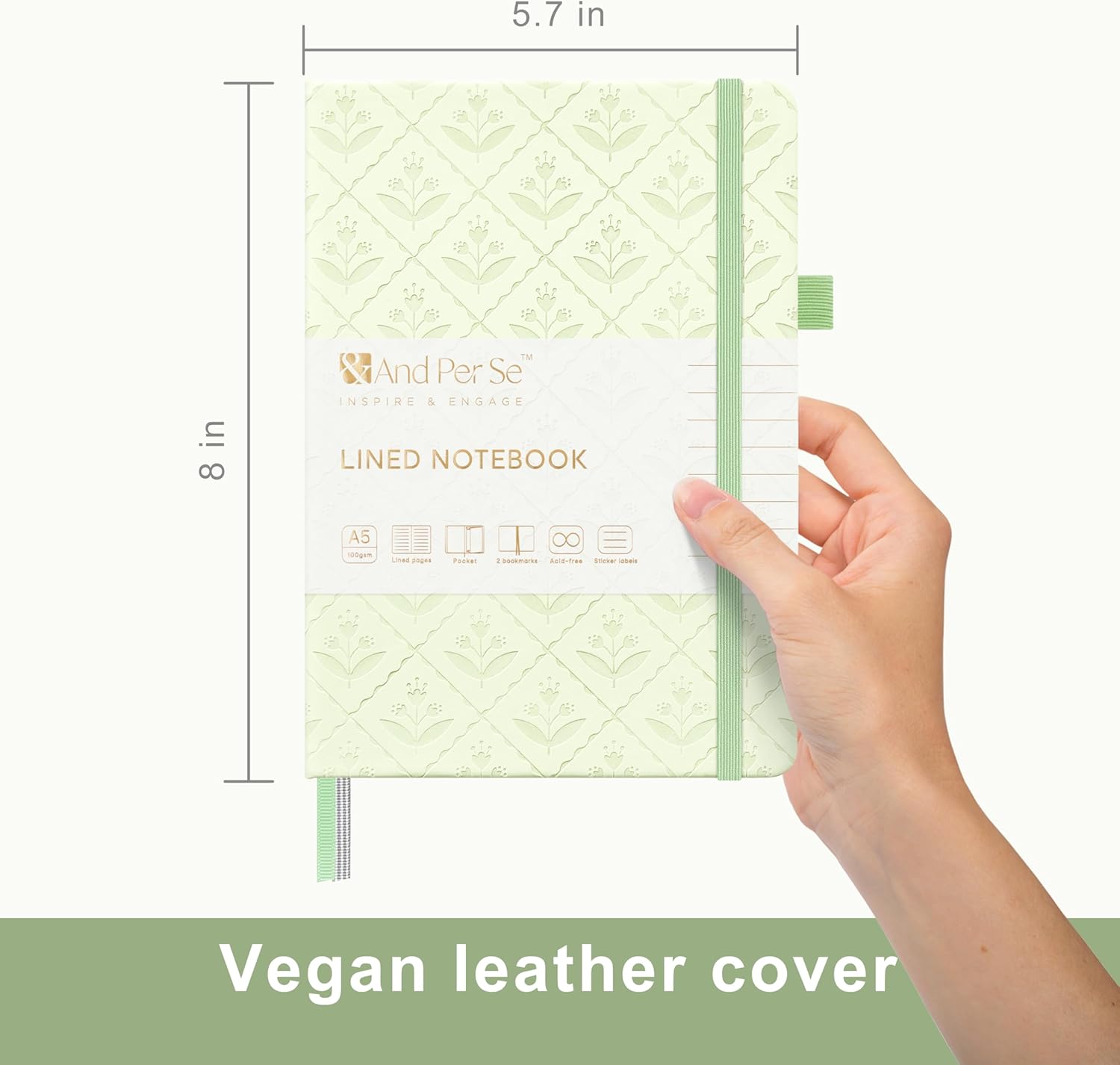 &And Per Se Lined Journal Notebook for Women&Men with Pattern, 160 Pages 100GSM Thick Paper, A5 Hardcover Journals for Writing(Light Green)