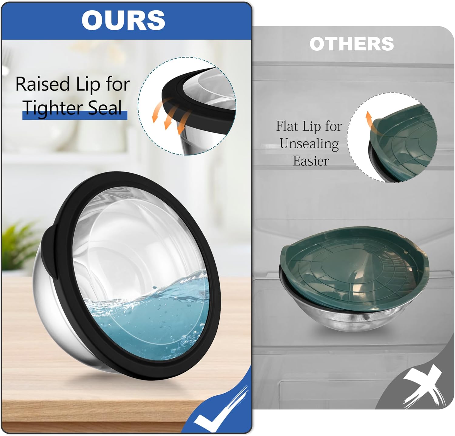 - PRACTICAL LIDS: These airtight lids with raised lip for sealing tightly, Helping keep the food fresh in the refrigerator for longer time and leak-proof, The lids with transparent design allow you to see the food inside the bowls and no need to open, Convenient for checking what’s stored, Arched design on one sides of the lid for easy opening and closing