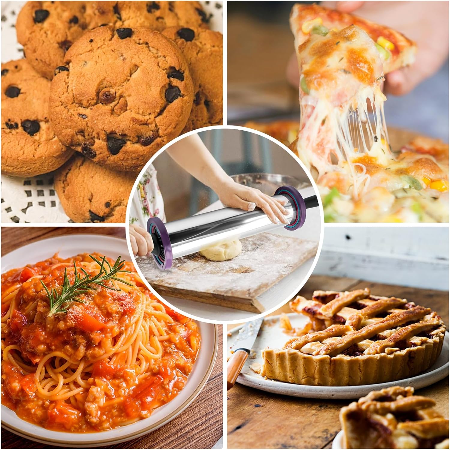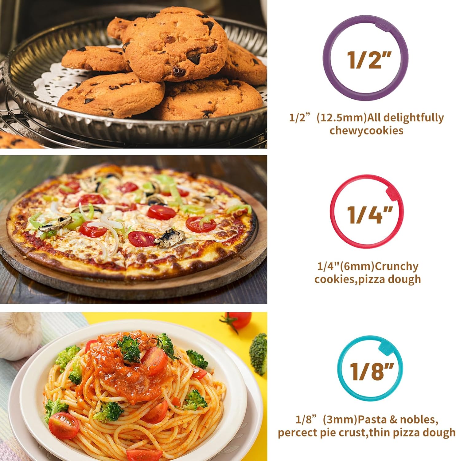 - Adjustable Rollig Pin: Adjustable Rolling Pin with Thickness Rings have 3 sizes of detachable rings: 1/2, 1/4 and 1/8 inch are used to knead the dough to the expected thickness easily of cooking. The stainless steel rolling pin in can be used to create any mixture you can imagine, such as pizza and pie, egg tart, bread, cookie, dumpling, pancake, pastry and other foods. And moreover you can teach your children to bake in the kitchen with it