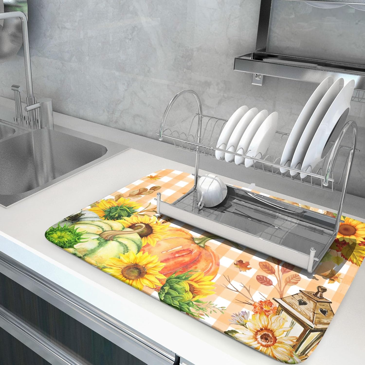Autumn Maple Leaf Orange White Check Plaids Dish Drying Mat for Kitchen Counter,Fall Sunflower Pumpkin Drying Mat 18 x 24 Inch with Absorbent Reversible Microfiber Dish Drying Pad for Coffee Bar