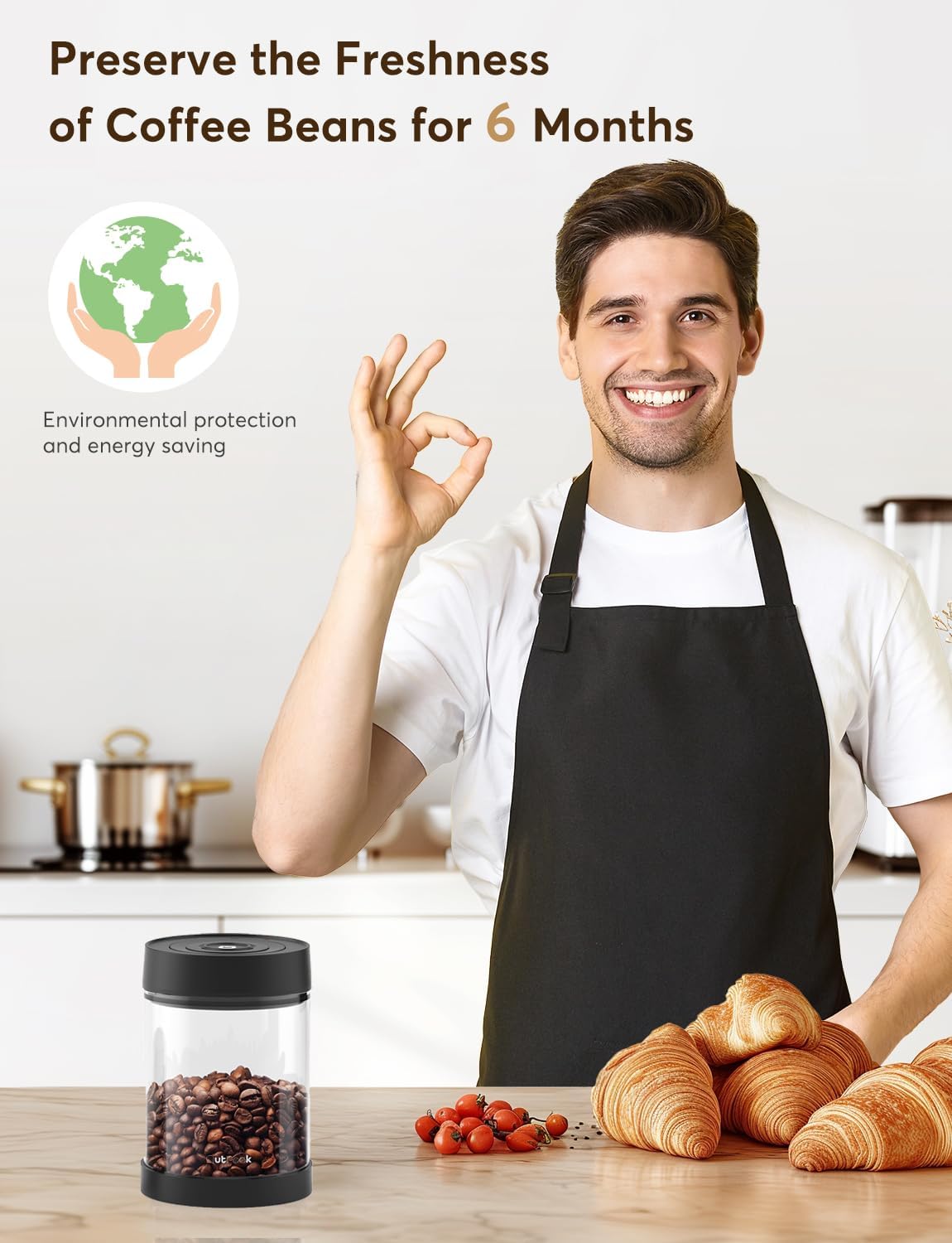 - Stay Sealed & Auto Vacuum: The OutPeak coffee container, with an automatic air sensor chip, maintains an auto-vacuum condition during sealing for energy efficiency. Operating for 3-6 months on a single charge, it cuts electricity costs while preserving the original oil and flavor of your coffee beans