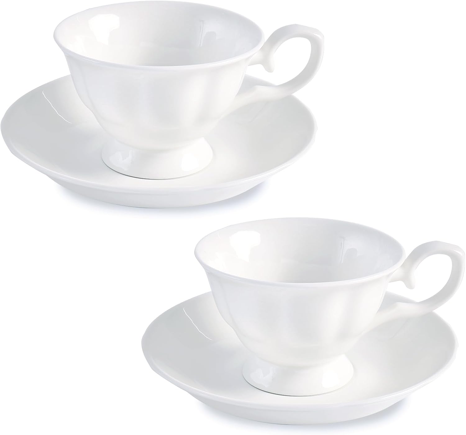 - [Royal Luxury] This tea cup set includes two elegant fine bone china 4 oz British royal-style tea cups and two matching non-slip saucers. The uniquely embossed design enhances the porcelain tea cup's noble appearance, adding a touch of sophistication and elegance. Perfect for afternoon tea, this vintage tea cup and saucer set is ideal for entertaining guests or as a gift for tea lovers