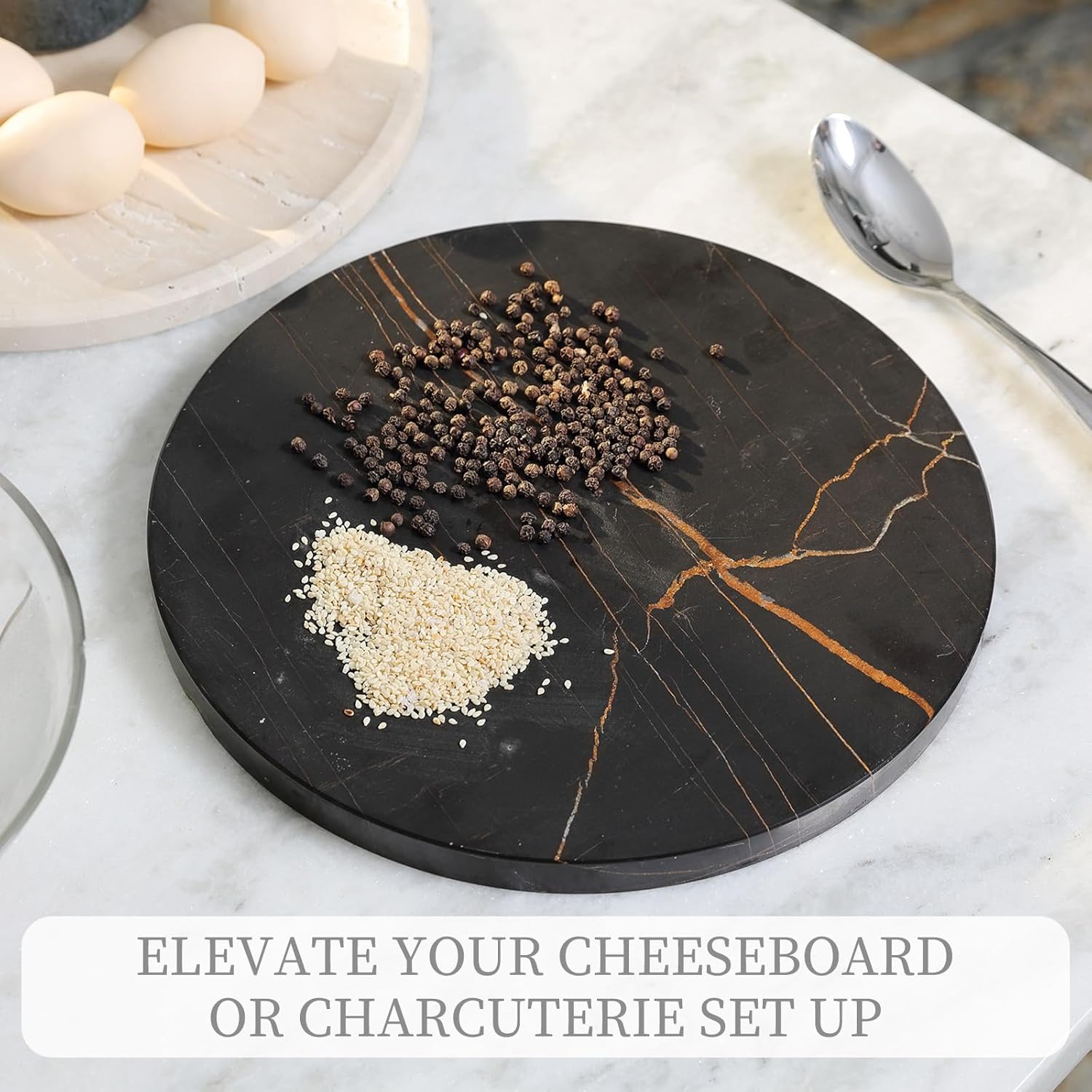 Koville Natural Marble Cutting Board for Kitchen, 11inch Round Hand Crafted Marble Slab for Cheese, Charcuterie, Pastry Board - Wedding Gift, House Warming Gift(NOIRAZIZA)