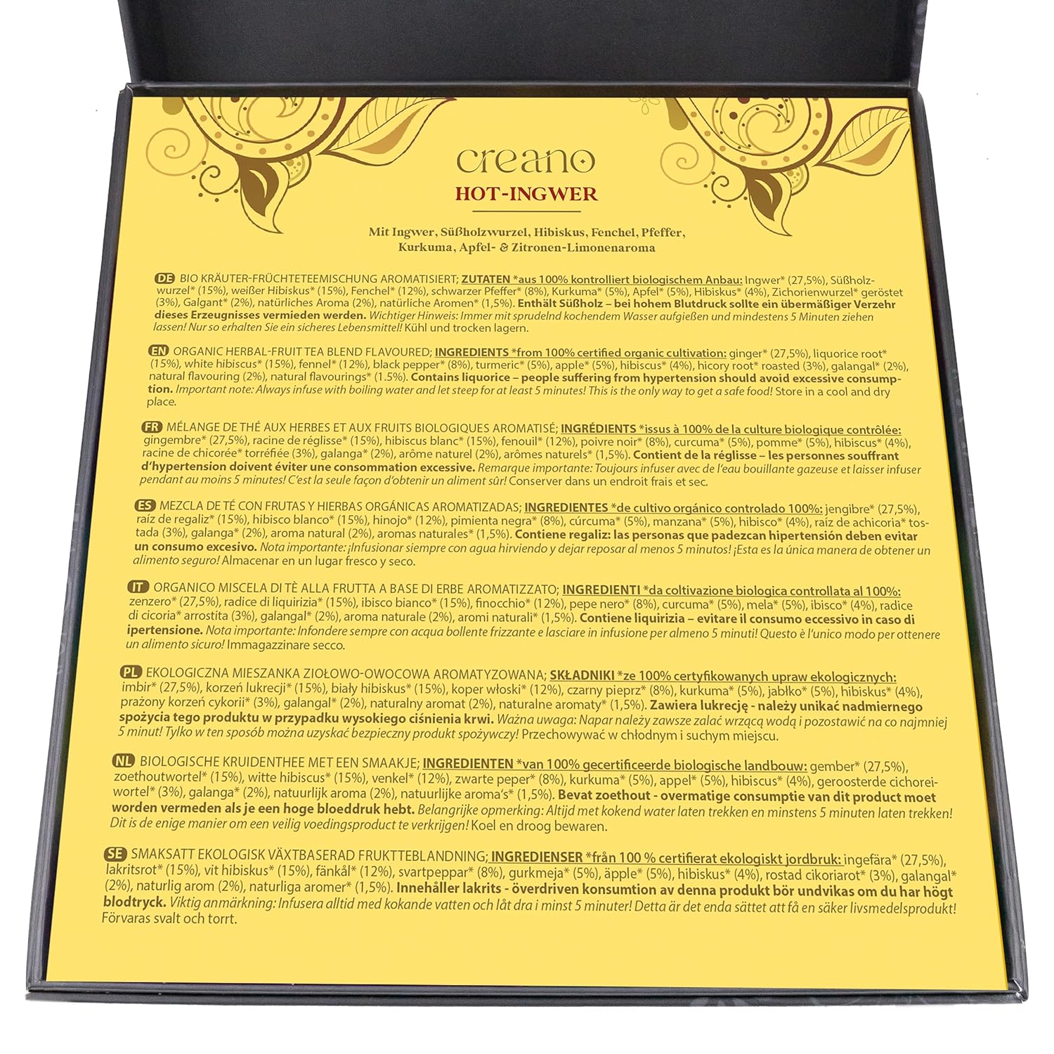 - Creano Organic Herbal-Fruit-Spice Tea Mix Gift Set ‘Organic Herbal Tea’ is a unique blend of the different organic tea varieties: Fruity-Chamomile, Hot-Ginger, Turmeric-Chai, Rooibos-Mango, Sweet-Red-Chai, Evening-Tea, Sweet-Mint, Gentle-Mood and Wellness-Tea