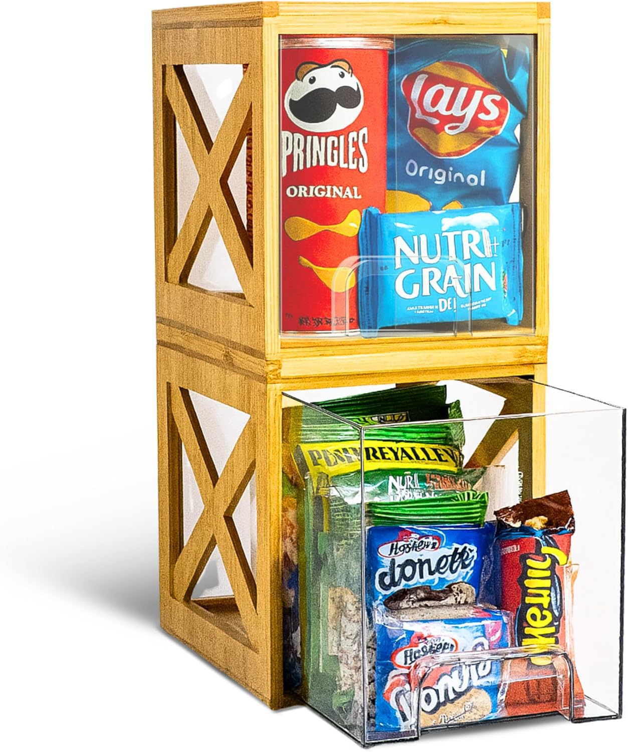 Bamboo Snack & Pantry kitchen Organizer – 2 Pack Bamboo Stackable Storage Drawers – Pull Out Storage for Cookies, Spices, Coffee Pods & K Cups – Clear Acrylic Drawer for Countertop Use