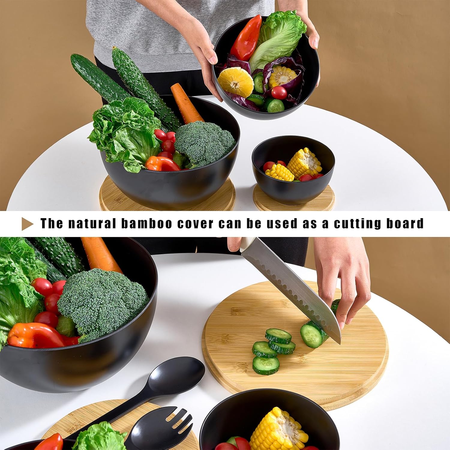 Large Salad Bowls with Bamboo Lids Set of 3, Mixing Nesting Bowls Round Serving Bowls with Servers for Salads, Kitchen Eating, Pastas, Popcorn, Chips, Trifle, Fruit, Food Prepare (Black,10",8",6" )