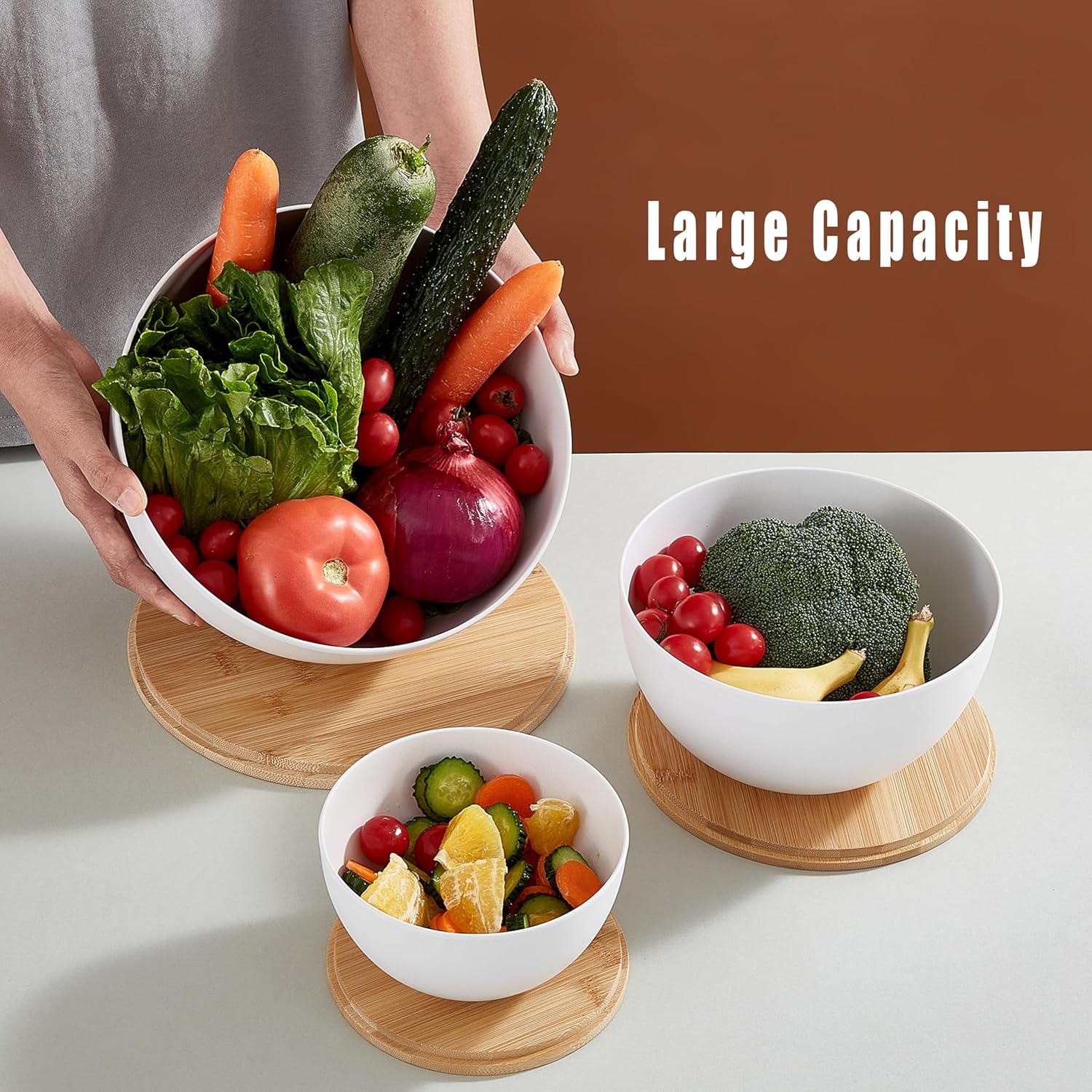 JOYMAY Salad Bowls, Mixing Bowl Salad Bowl Set, Natural Bamboo Fiber Serving Bowl Set of 3 with Bamboo Wood Lid, Nesting Bowls for Salads,Pastas(White,10",8",6")