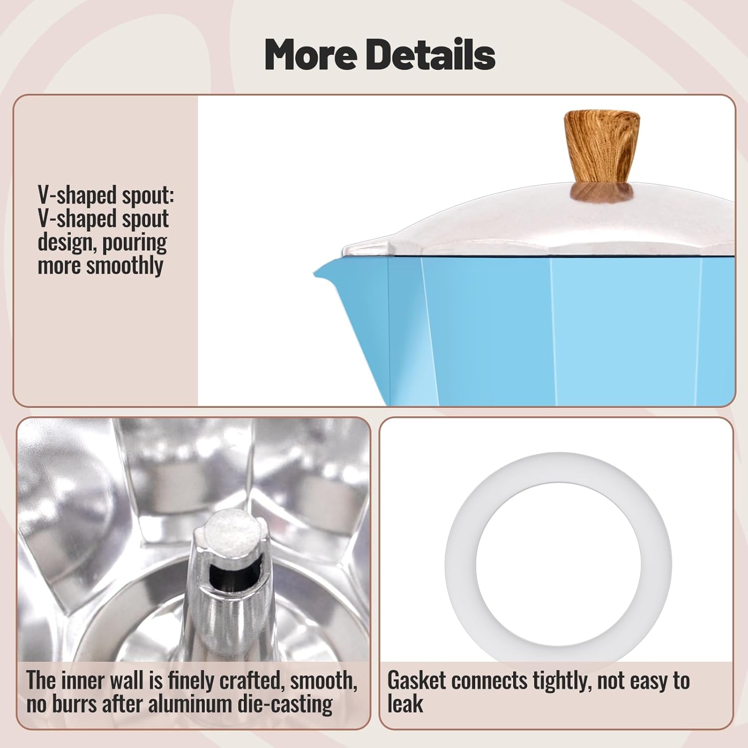 3 Cup Aluminum Moka Pot Classic Stovetop Espresso Coffee Maker 150ml 5oz Coffeemaker Percolator Mocha Pot Greca Coffee Maker Cafe Makers for Italian and Cuban Café Brewing Blue