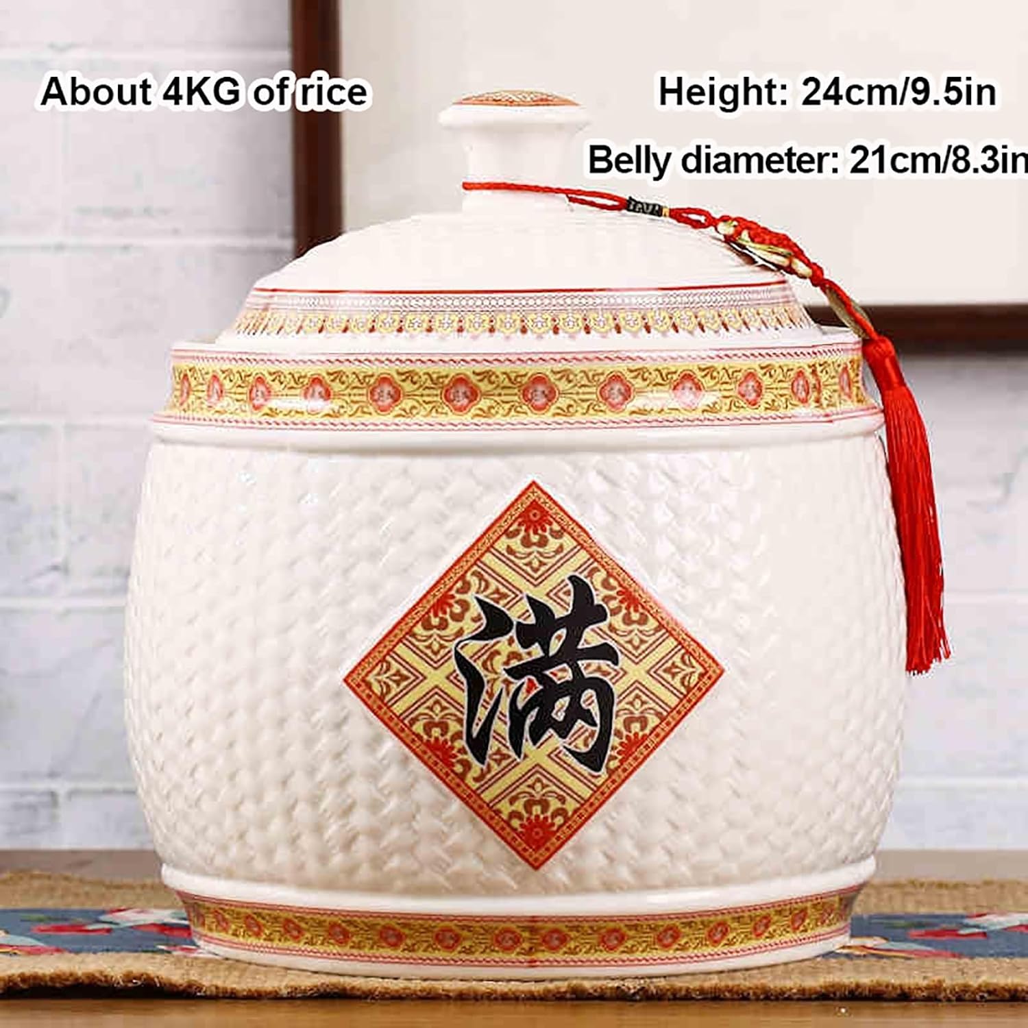 Chinese Sealed Large-Capacity Rice Pot, Ceramic Rice Bucket With Tassel Design, Grain Storage Ceramic Container, Rice Dispenser Airtight Storage Bucket For Grains Snacks Candy Coffee Beans Food(B,Capa