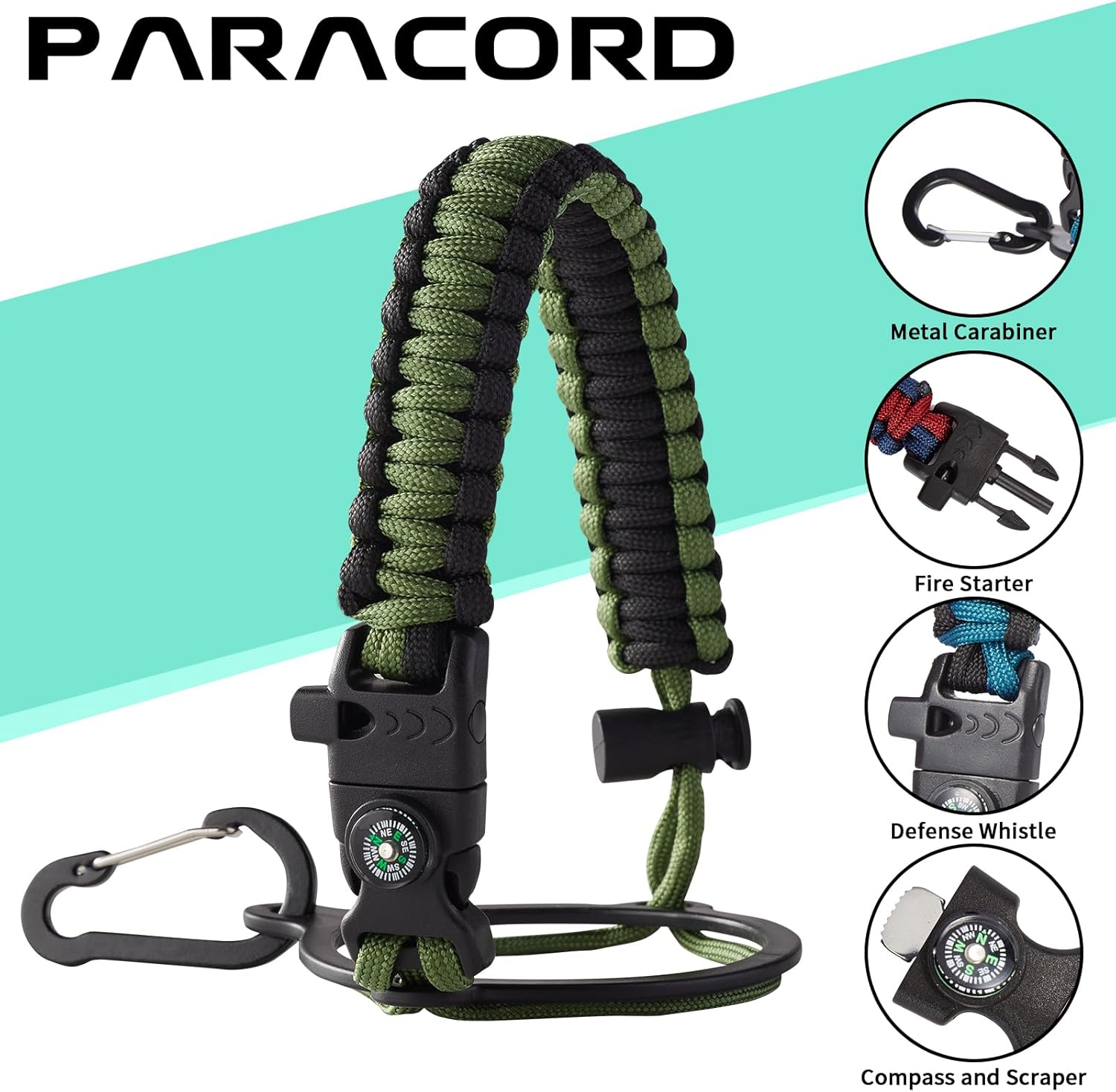 - UNIQUE DESIGNS PARACORD HANDLE: Full-function paracord handle made in individual styles to match the color of the flask water bottles. With compass, safety ring, carabiner, flint fire starter & whistle. It unravels into a sturdy and taut rope in an emergency, making the large water jug an ideal survival kit for expeditions in the wild