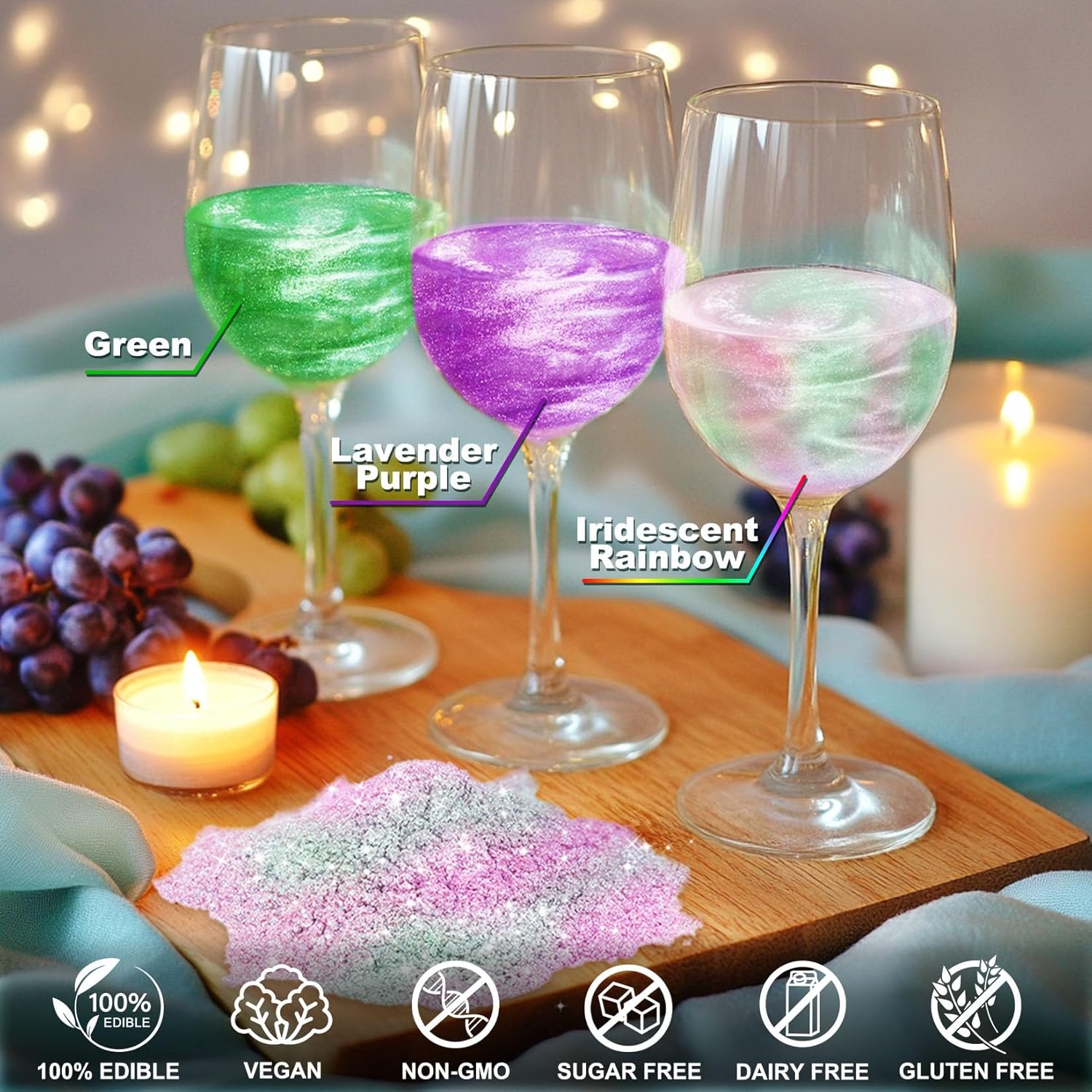 - Versatile Edible Glitter Set - Our edible glitter for cocktails includes 3 shimmering colors - luster dust edible in green, purple, and a stunning Iridescent Rainbow. Enhance your cocktails, cupcakes, and baking creations with these eye-catching edible glitter, ensuring your food is never dull again! Each bottle holds 5g.