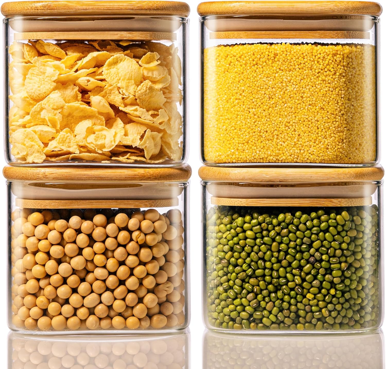 - [ Premium Glass Jars with Bamboo Lids Set of 4 ]: Square glass jars with lids set have 4 pack 21floz glass storage jars, and the size is 4.0 x 3.6 inch, suitable for salad & fruit meal prep jars, and storing various ingredients, snacks, cookie, tea, candy, oats and spices.The 21floz glass jars with airtight lids are perfect to store food for maximum freshness and convenience in cabinet and pantry. With 4" wide mouth design, which can easily take out and refill with any type of foods