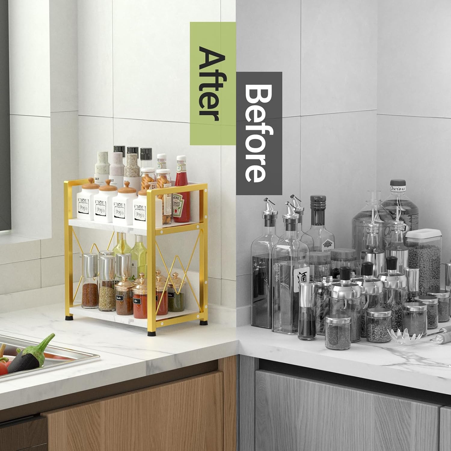 - Efficient Space-Saving Design: The two-tier structure of this kitchen counter organizer provides ample storage for all your coffee bar essentials and spice shelf items, making it a versatile addition to any countertop, whether as a coffee station organizer or a general countertop storage solution