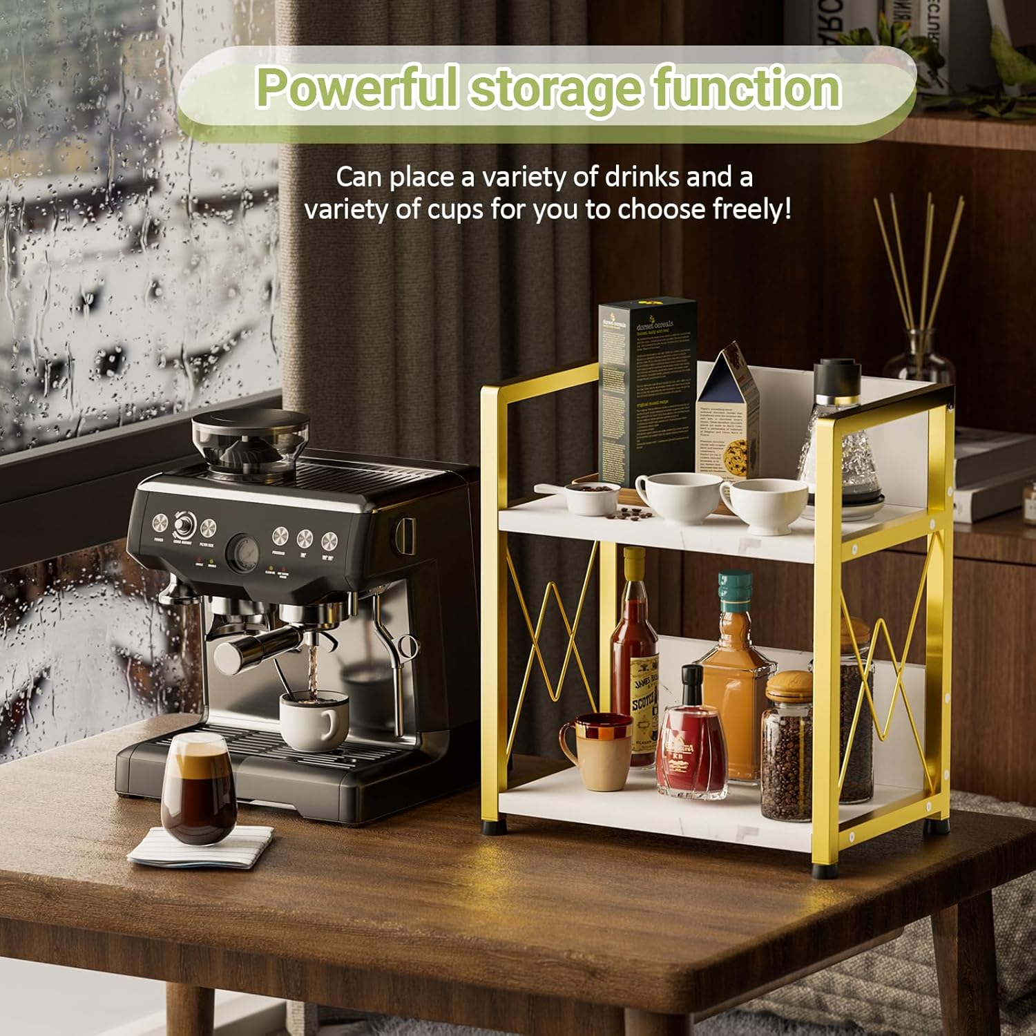 - Elegant Design for Your Coffee Bar: Our countertop shelf organizer elegantly blends rustic charm with modern design, making it the perfect coffee bar organizer to enhance the overall aesthetics of your kitchen space while complementing your coffee station accessories