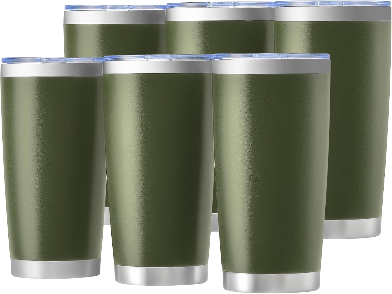 OMTech 20oz Tumblers Bulk, 6pc Stainless Steel Tumbler Set with Lid & Straw, Double Wall Vacuum Insulated Mug for Laser Engraver, Travel Coffee Mug for Hot & Cold Drinks, Army Green Powder Coated Cup