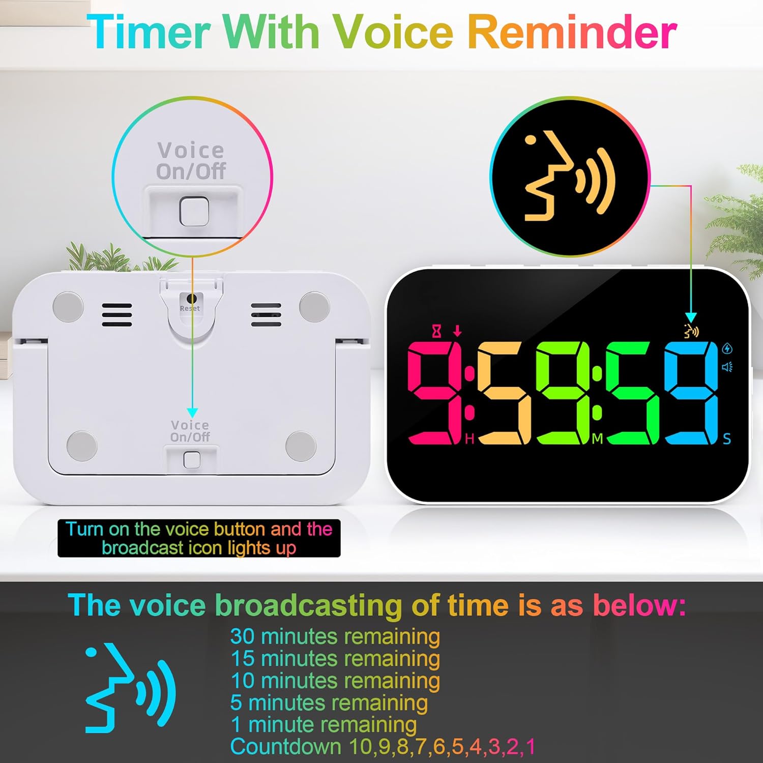 - TIMER WITH VOICE ANNOUNCEMENT REMINDER: Our cooking timer for kitchen has a voice on/off button on the back, when turned on, This timer will sound an audible reminder at 15 min, 10 min, 5 min, 1 min and the last 10 s, which can help you better control the time and progress when cooking. This voice reminder timer is more convenient and practical for the elderly or users with poor eyesight
